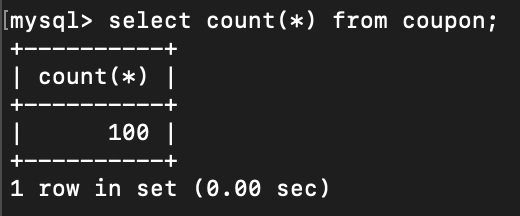 1L이라는 user_id를 가진 유저가 1000번의 시도를 한 결과 1번만 쿠폰이 발급되는 것을 확인할 수 있다.
