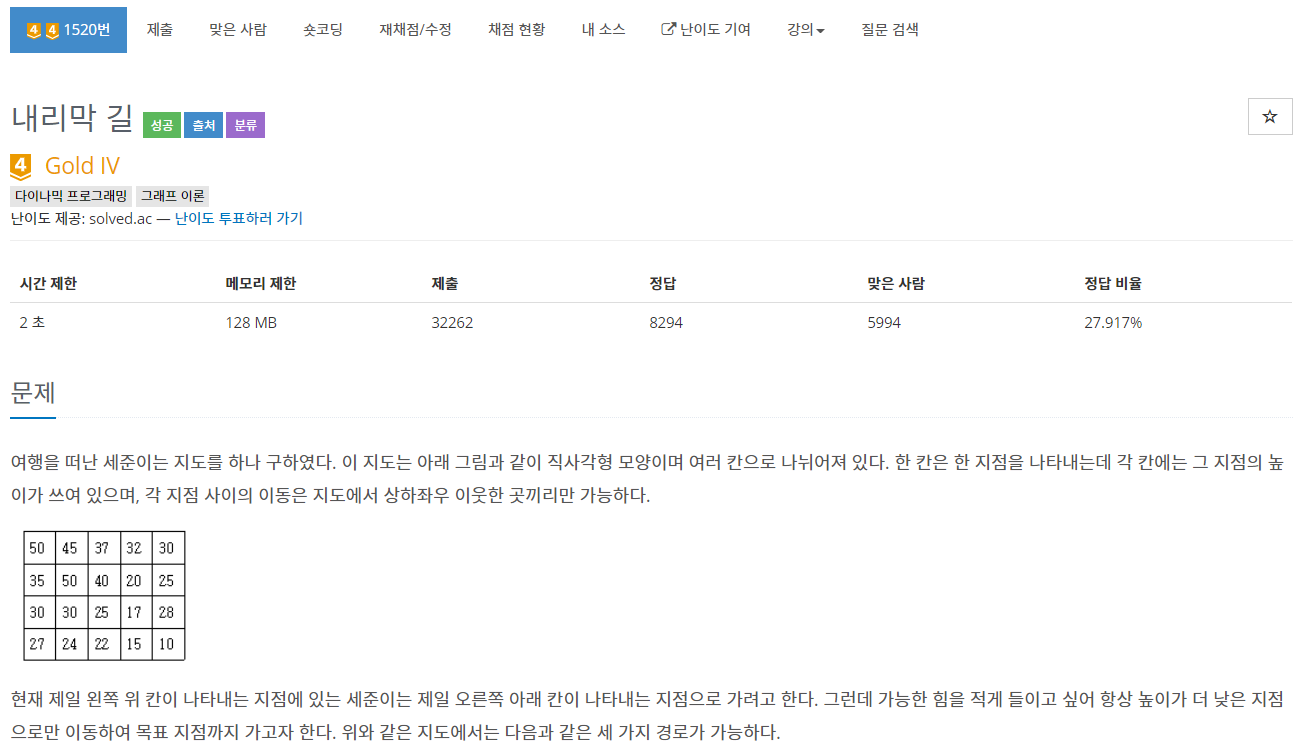여행을 떠난 세준이는 지도를 하나 구하였다. 이 지도는 아래 그림과 같이 직사각형 모양이며 여러 칸으로 나뉘어져 있다. 한 칸은 한 지점을 나타내는데 각 칸에는 그 지점의 높이가 쓰여 있으