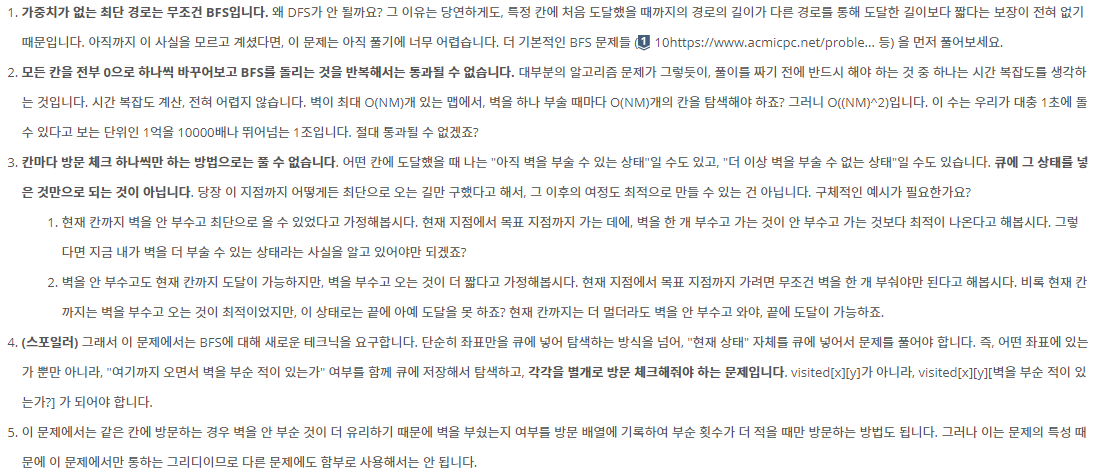 - 칸마다 방문 체크 하나씩만 하는 방법으로는 풀 수 없습니다. 어떤 칸에 도달했을 때 나는 "아직 벽을 부술 수 있는 상태"일 수도 있고, "더 이상 벽을 부술 수 없는 상태"일 수도 있습니다. 큐에 그 상태를 넣은 것만으로 되는 것이 아닙니다. 당장 이 지점까지 어떻게든 최단으로 오는 길만 구했다고 해서, 그 이후의 여정도 최적으로 만들 수 있는 건 아닙니다. 구체적인 예시가 필요한가요?