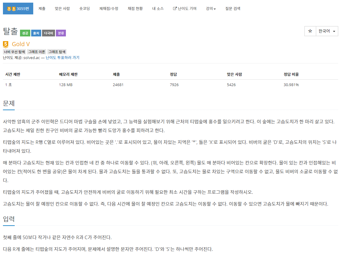 1. queue를 두개를 만들어서 고슴도치가 움직이는 queue, 물이 차는 queue를 만들어서 bfs를 돈다. 이게 최선일 것 같은느낌..?