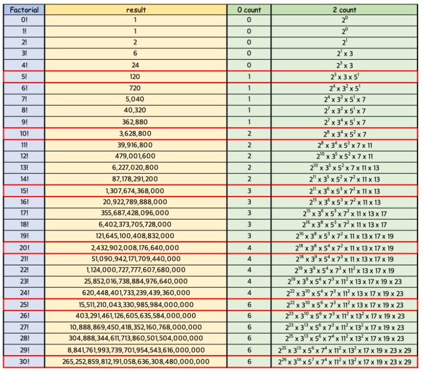 팩토리얼 값을 보면 2는 5보다 작은 수여서 연속된 수를 곱하게 되면 자연스럽게 모든 값들의 소인수 분해들은 2의 개수가 5의 개수보다 많다.