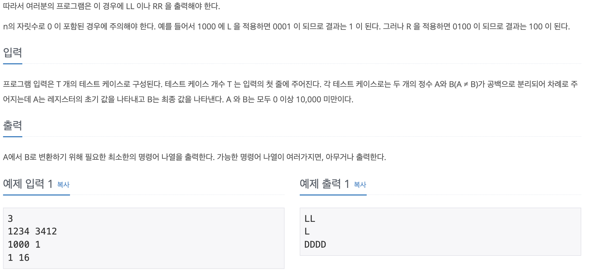 네 개의 명령어 D, S, L, R 을 이용하는 간단한 계산기가 있다. 이 계산기에는 레지스터가 하나 있는데, 이 레지스터에는 0 이상 10,000 미만의 십진수를 저장할 수 있다. 각 명령어는 이 레지스터에