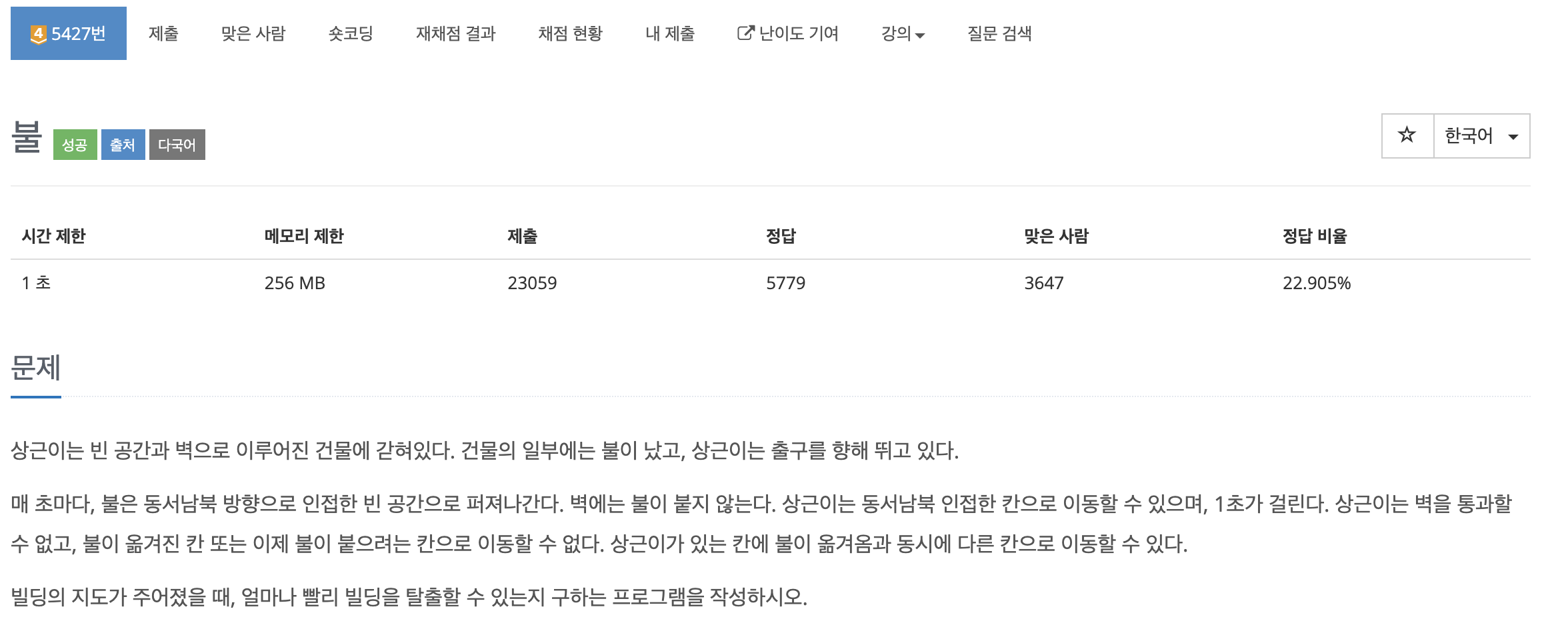 풀이 방법은 bfs를 사용했고, queue에 현재 저장되어있는 불들을 다 번지게 한 뒤, 상근이를 움직일 수 있게 해주었습니다. 만약, 상근이가 범위 밖으로 갈 수 있을 시 움직인 횟수를 return해주었고 상근이가 더이상 움직일 수 없어서 반복문이 종료되게 될때까지 return하지 못했다면 상근이는 건물을 벗어날 수 없는 것이기 때문에 -1을 return 해주었습니다.