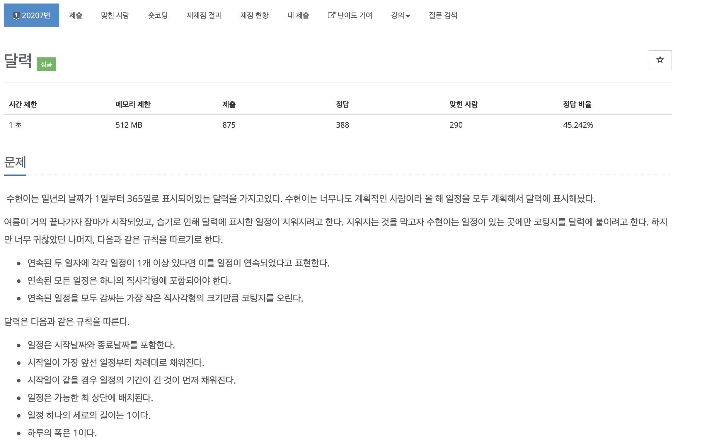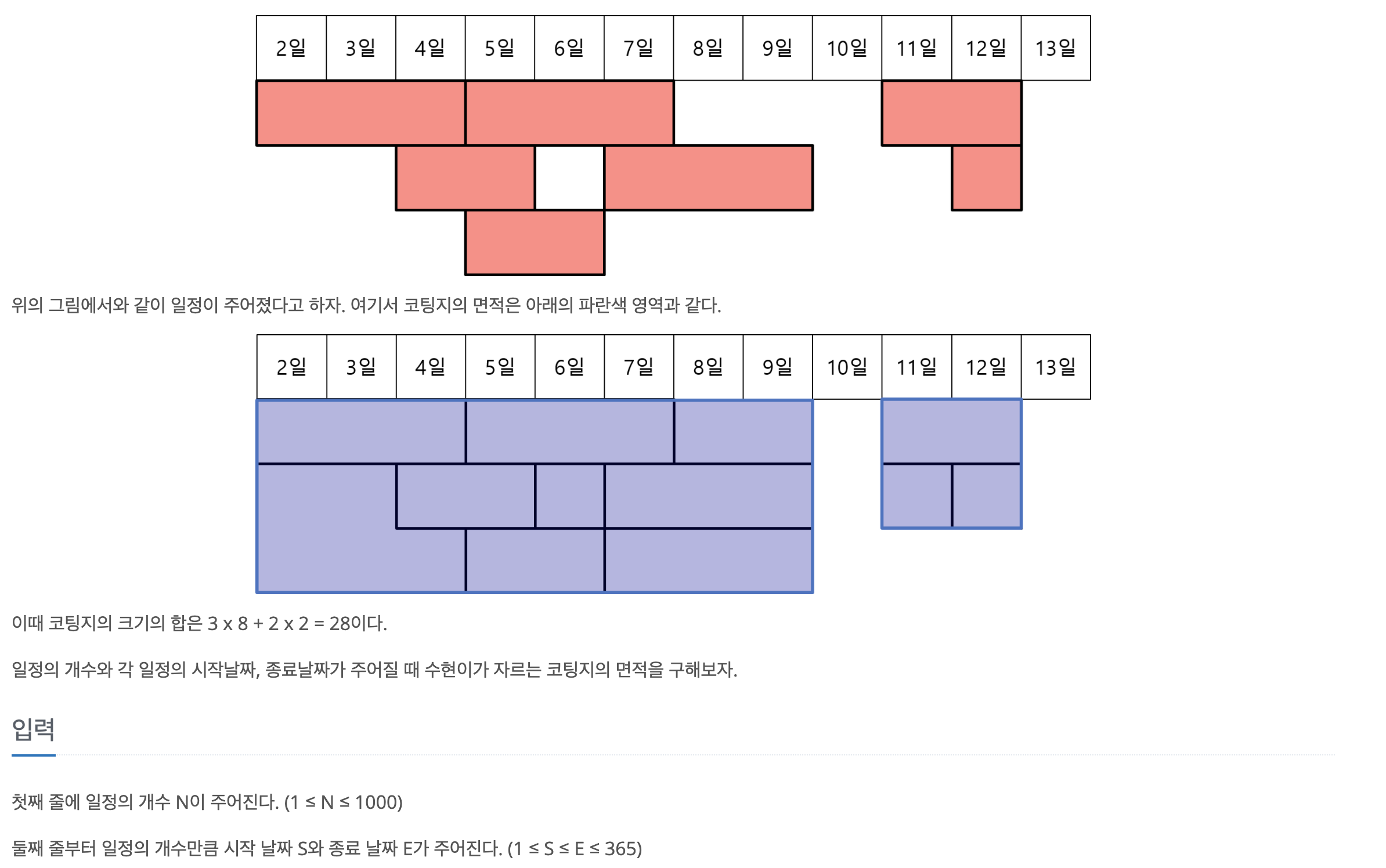 수현이는 일년의 날짜가 1일부터 365일로 표시되어있는 달력을 가지고있다. 수현이는 너무나도 계획적인 사람이라 올 해 일정을 모두 계획해서 달력에 표시해놨다. 여름이 거의 끝나가자 장