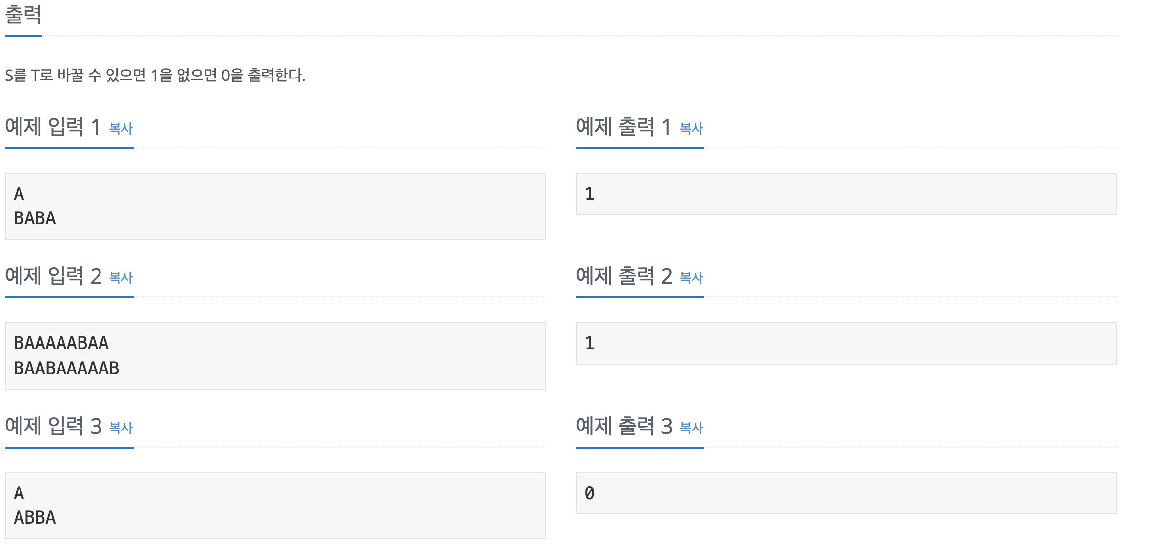 1. 큐에서 나온 문자열이 S와 같은 경우 : answer을 1로 초기화한 후 bfs 종료합니다.