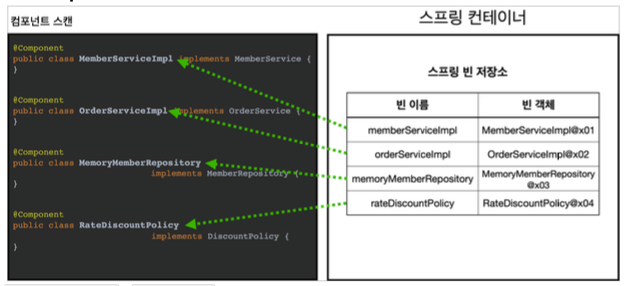 - @ComponentScan은 @Component가 붙은 모든 클래스를 스프링 빈으로 등록합니다.