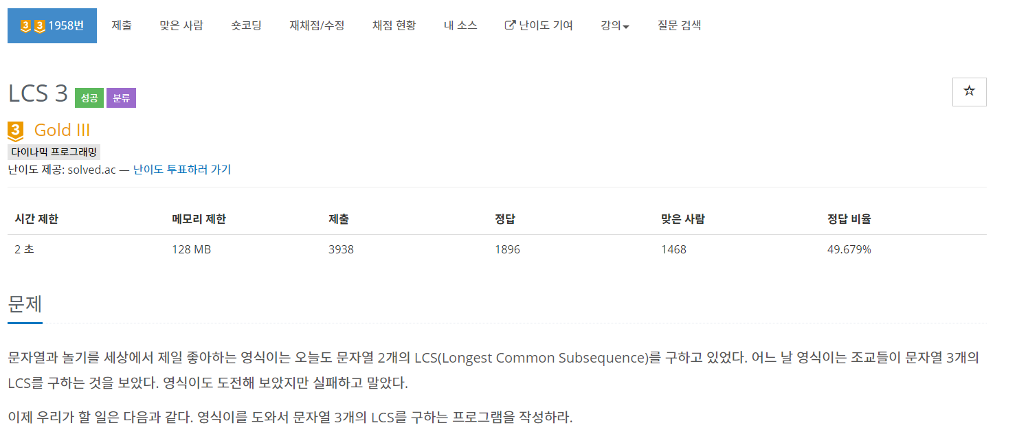 정답 코드 : LCS algorithm의 방식을 3차원으로 가져와서 풀었다. (https://www.youtube.com/watch?v=EAXDUxVYquY - 알고리즘 설명 링크)