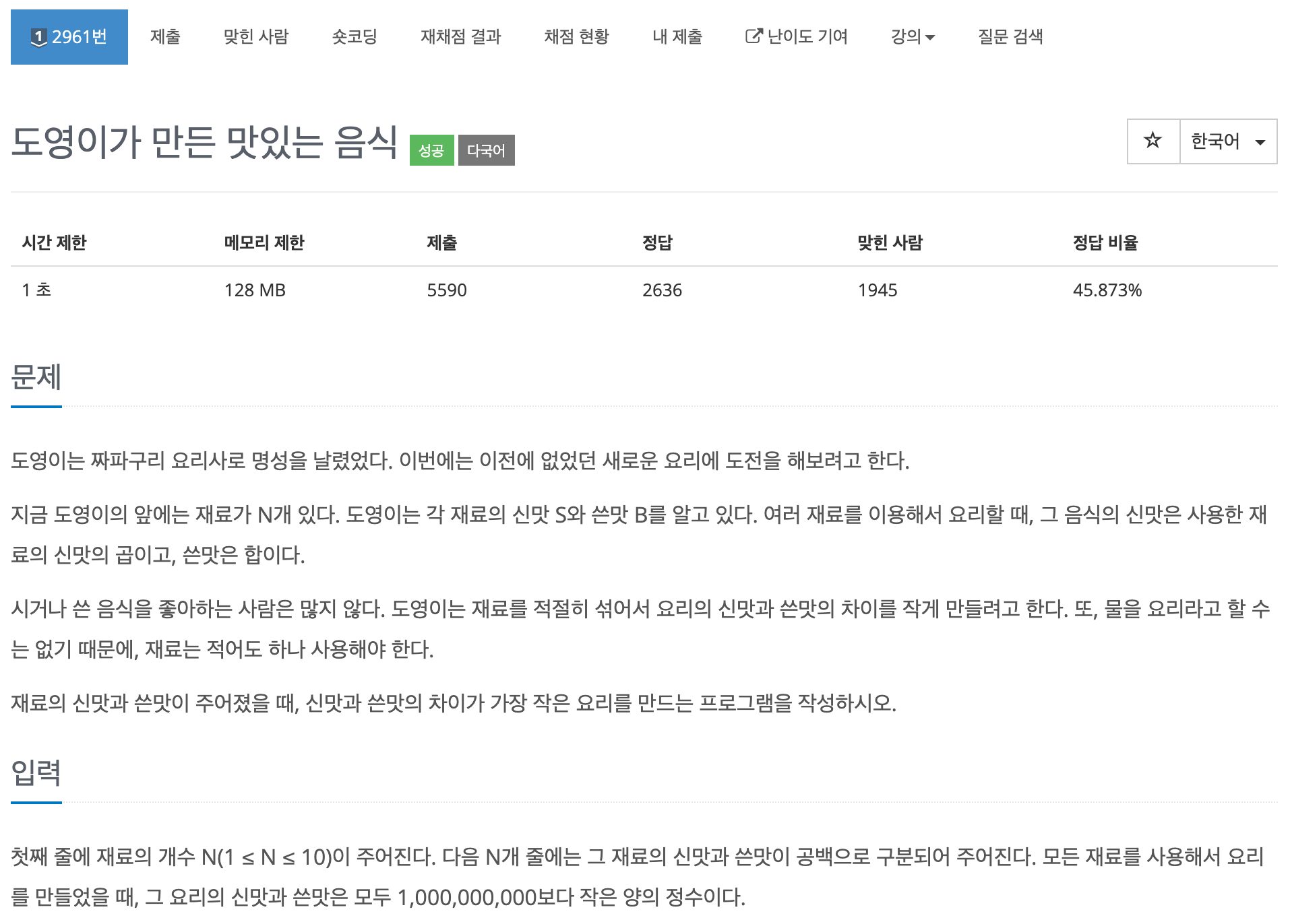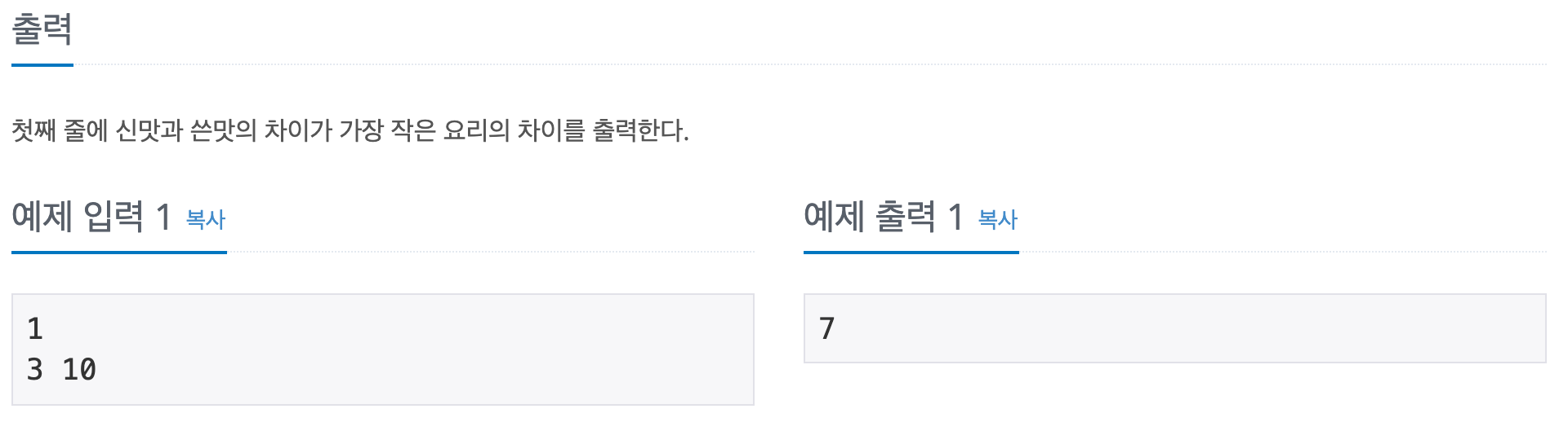 적절히 조합하여 신맛과 쓴맛의 절대값차이가 가장 적은 수를 구하면 되는 문제입니다.