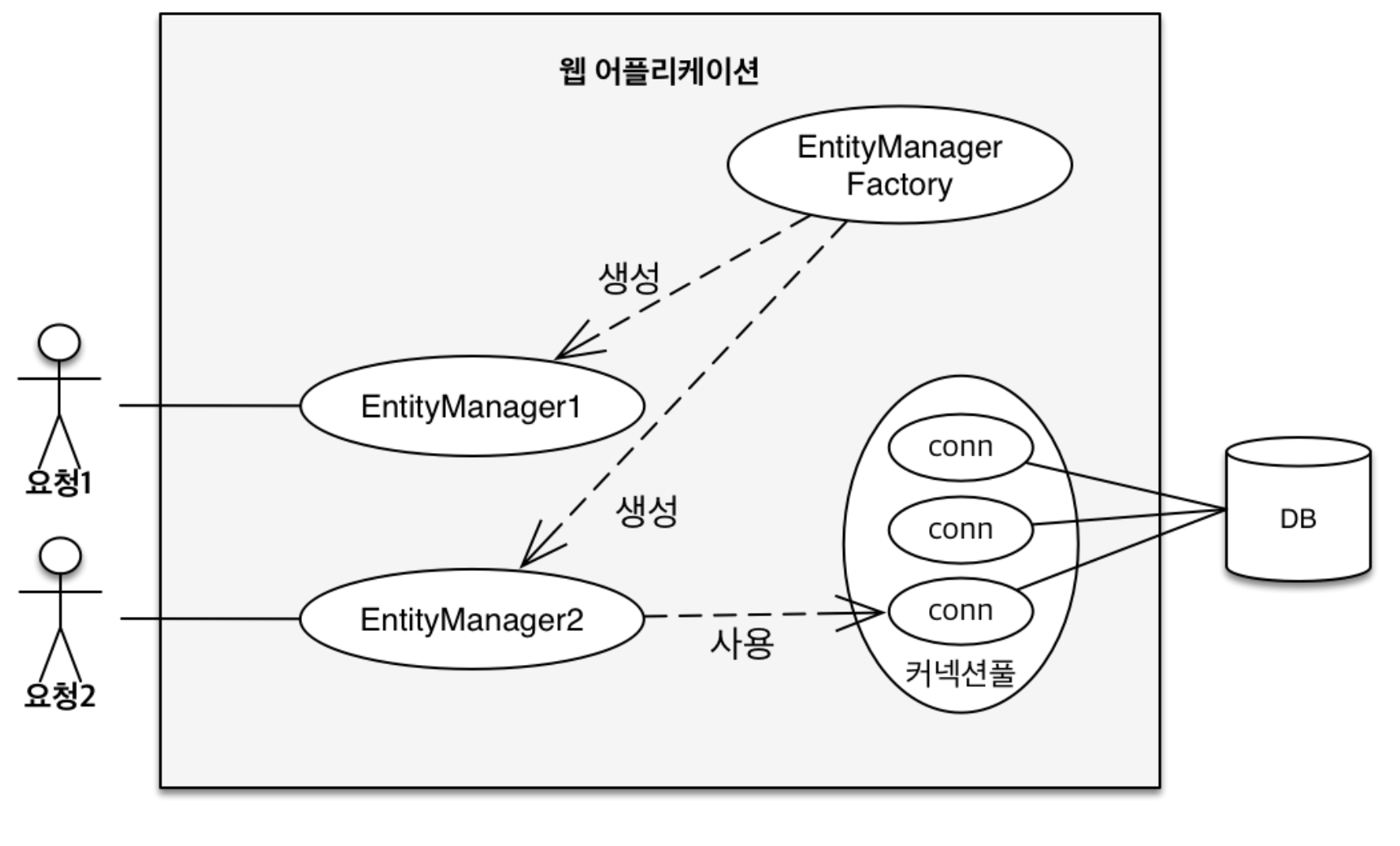 예를들어 웹 어플리케이션을 개발할 때 사용자의 요청에 따라서 EMF를 통해 EM을 생성합니다. EM은 내부적으로 DB 커넥션을 통해 DB를 사용합니다.