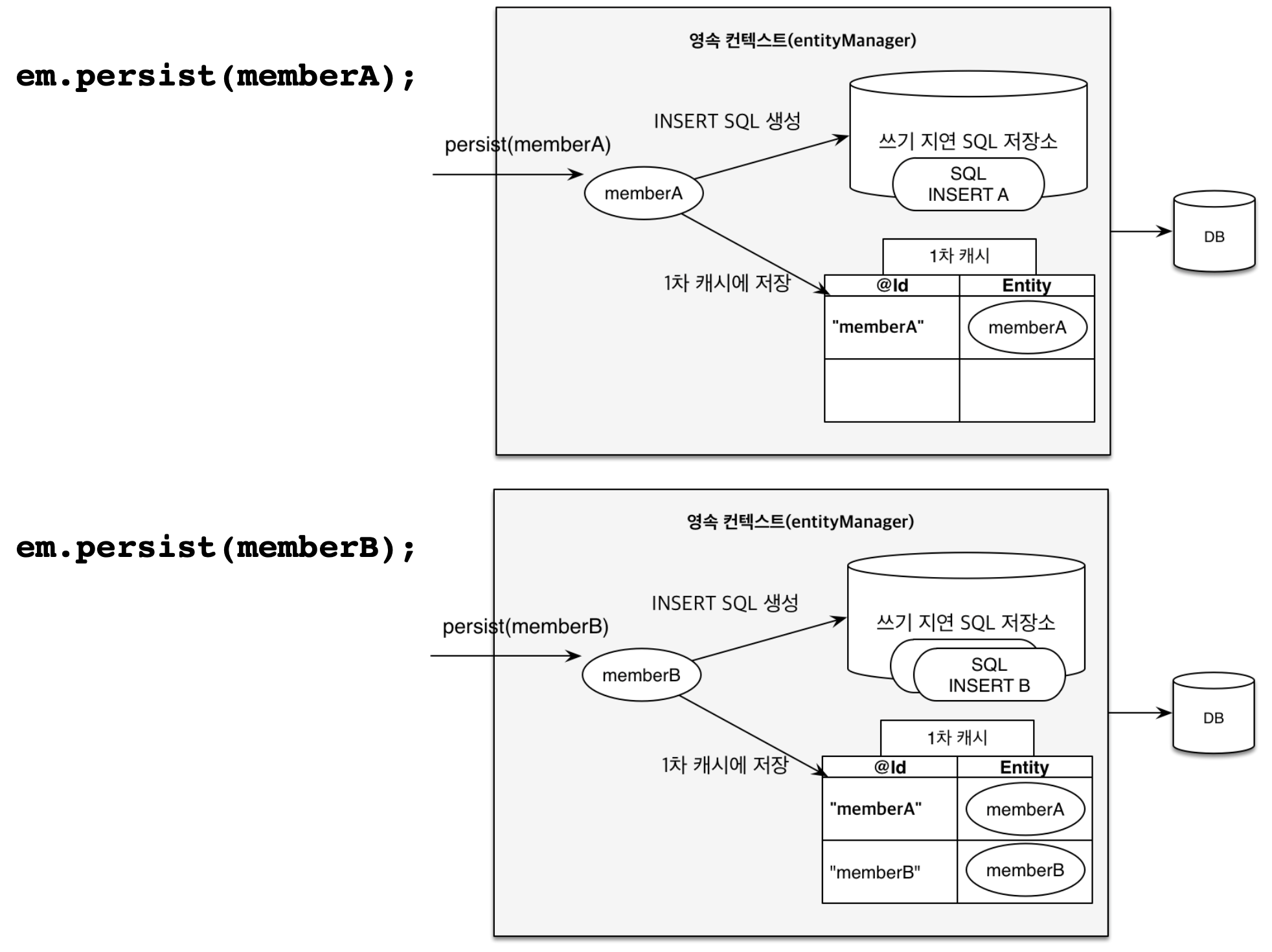 (아직 어떤 느낌인지 모르겠습니다... ?!?!?!?)=> 실제 확인해보니 em.persist할 때 쿼리문이 나가지 않고 쓰기 지연 SQL 저장소에 쿼리가 저장되고 commit이나 flush를 할 경우 DB에 쿼리문을 보내어 DB를 동기화 시켜줌