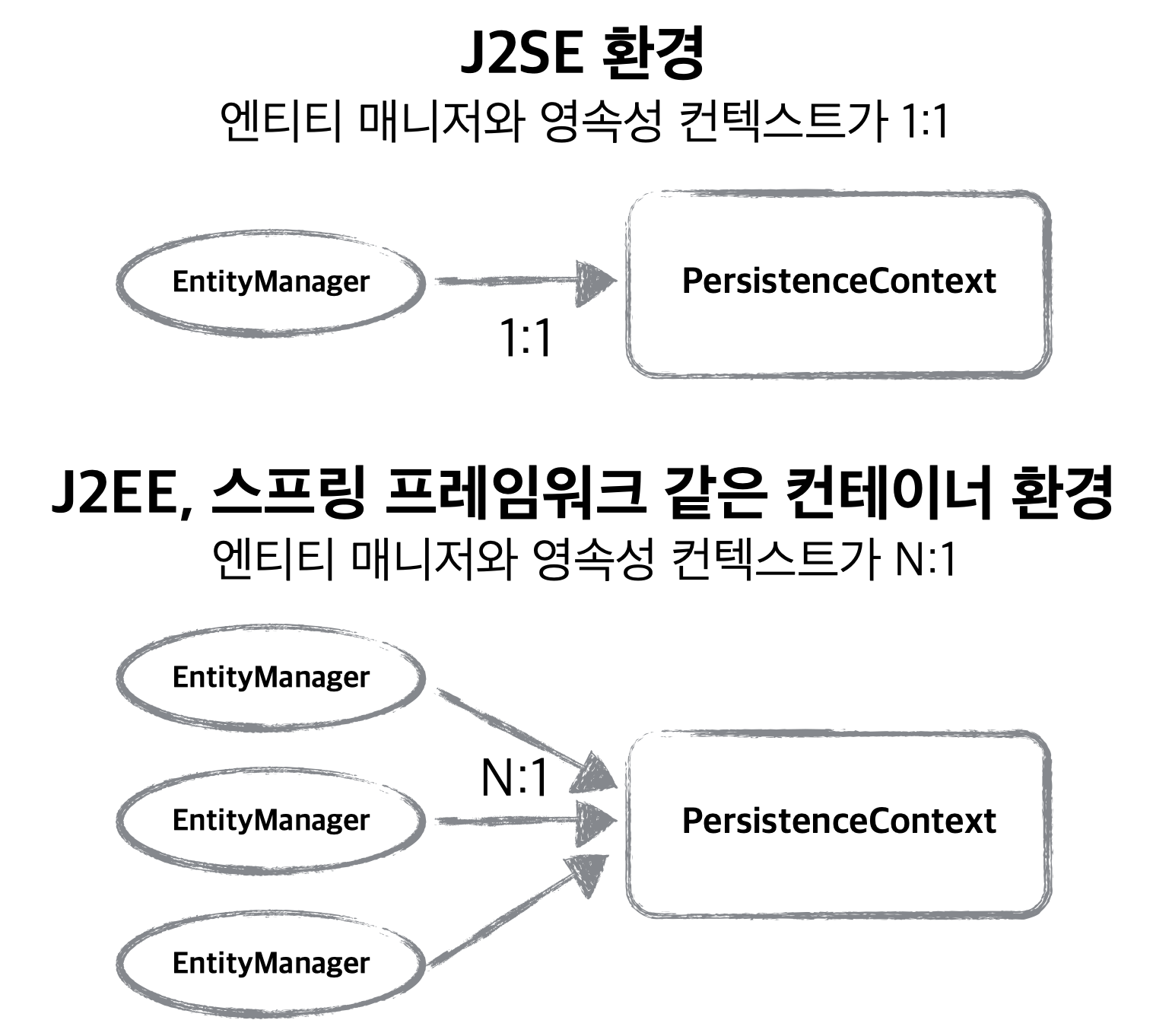 - EM과 영속성 컨텍스트는 J2SE 환경에서 1:1로 매핑됩니다.