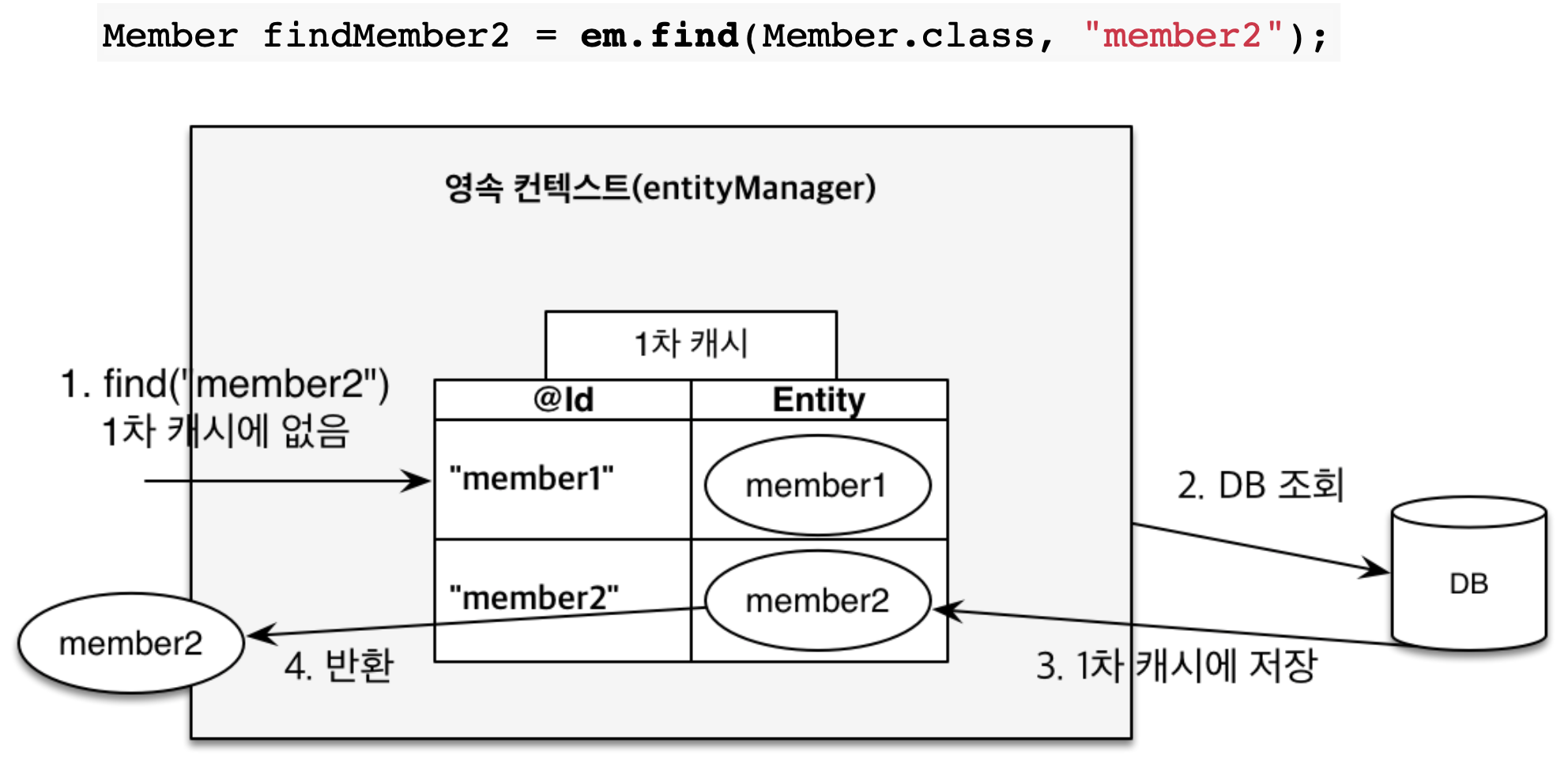 em.persist로 1차 캐시에 저장이 되었다고 가정한뒤, 조회한다고 합시다. 조회를 할 경우 DB를 먼저 조회하는 것이 아닌 1차 캐시에서 먼저 조회를 하게 됩니다. 그때 1차 캐시에서 원하는 객체가 있는 경우 DB를 조회하지 않고 바로 객체를 반환 받을 수 있습니다.