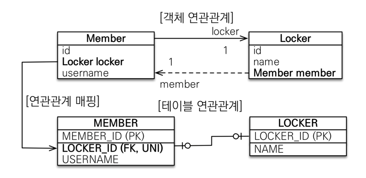 - 테이블은 외래 키 하나로 두 테이블이 연관관계를 맺는다.