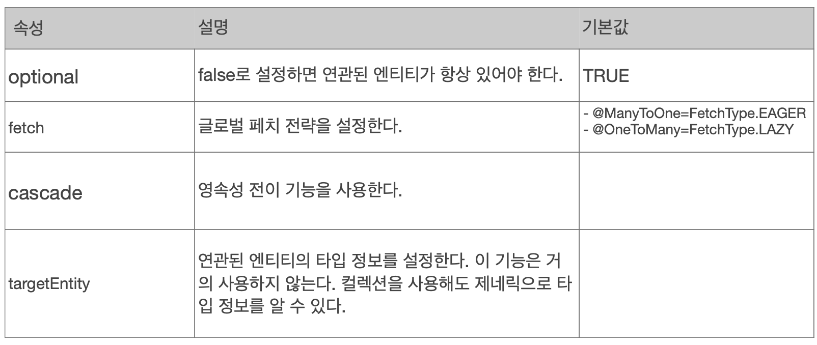 - @JoinColumn을 꼭 사용해야 함. 그렇지 않으면 조인 테이블 방식을 사용함 (중간에 테이블을 하나 추가함)