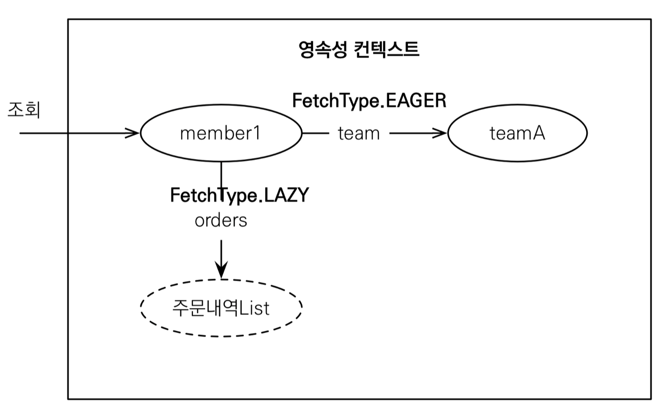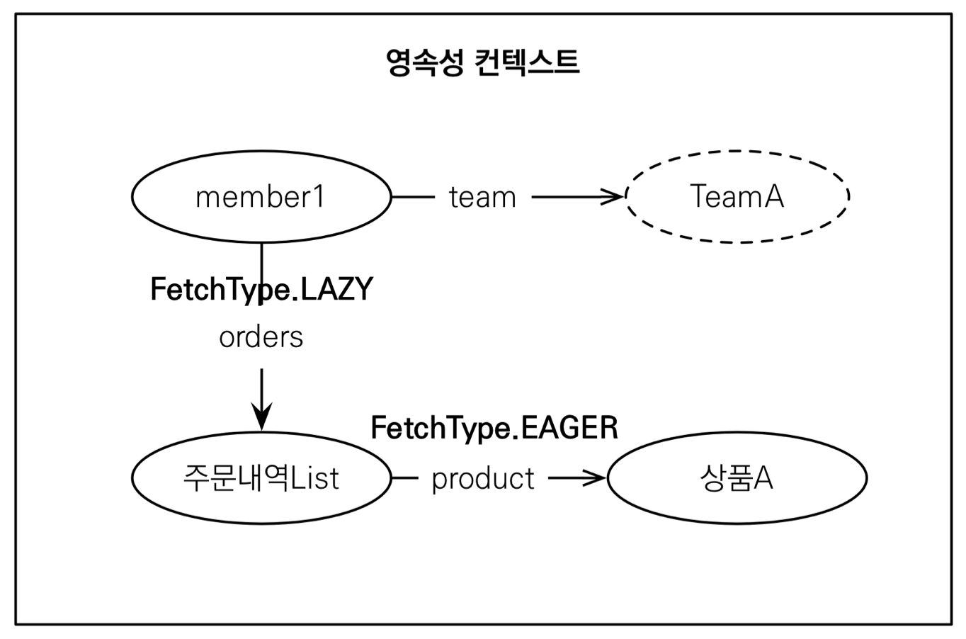 - 위의 설명은 이론적인 것, 실무에서는 모두 지연 로딩으로 해야함.