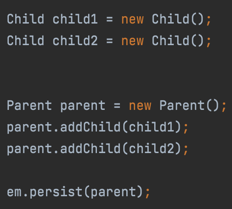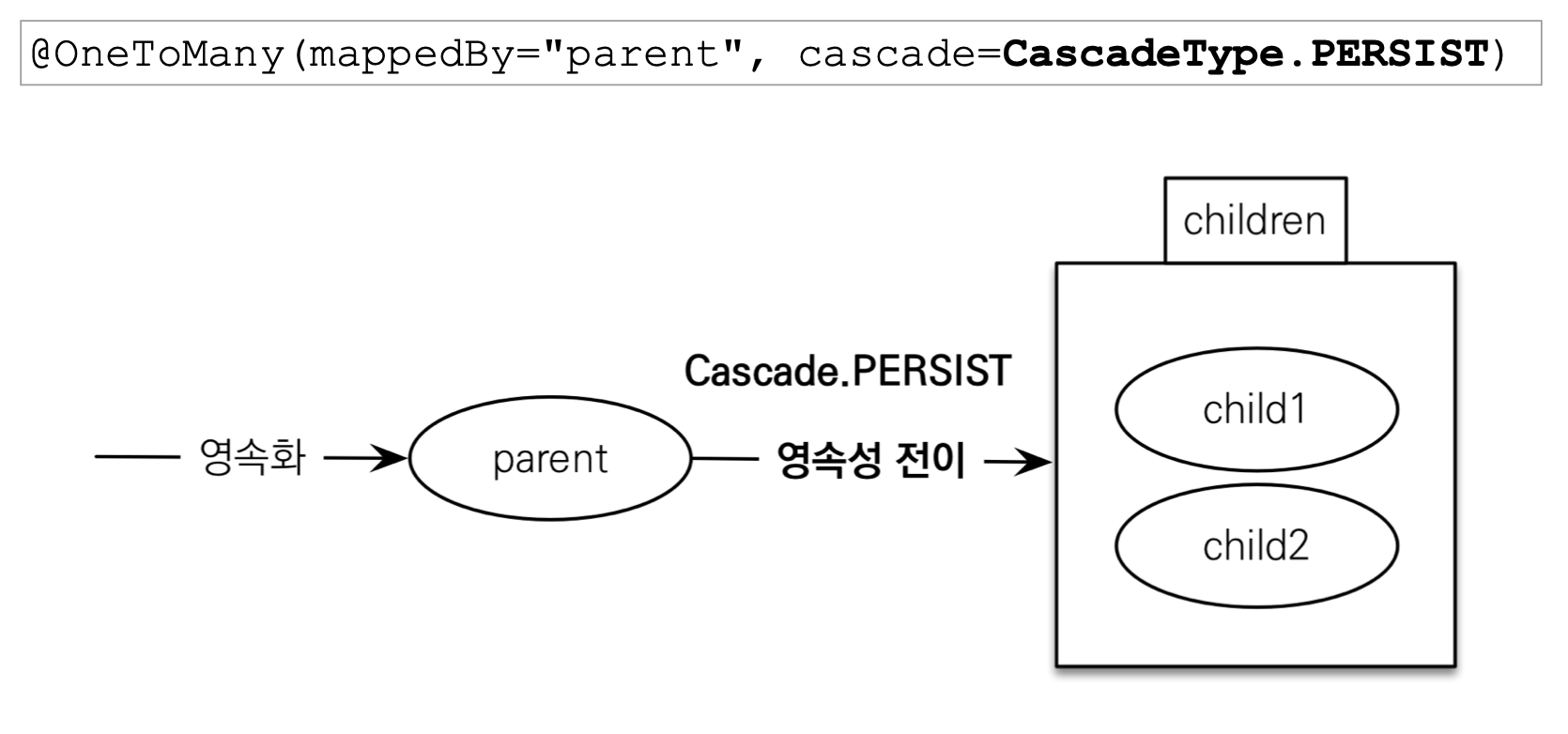 - 예 : 부모 엔티티를 저장할 때 자식 엔티티도 함께 저장