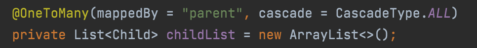 - 위의 경우처럼 parent -> child일 때, child와 다른 객체가 연관관계가 없다면 cascade를 사용해도 되지만 child에 또 다른 객체가 연관관계가 있다면 사용하면 안된다고 합니다. (이유는 알게되면 정리)