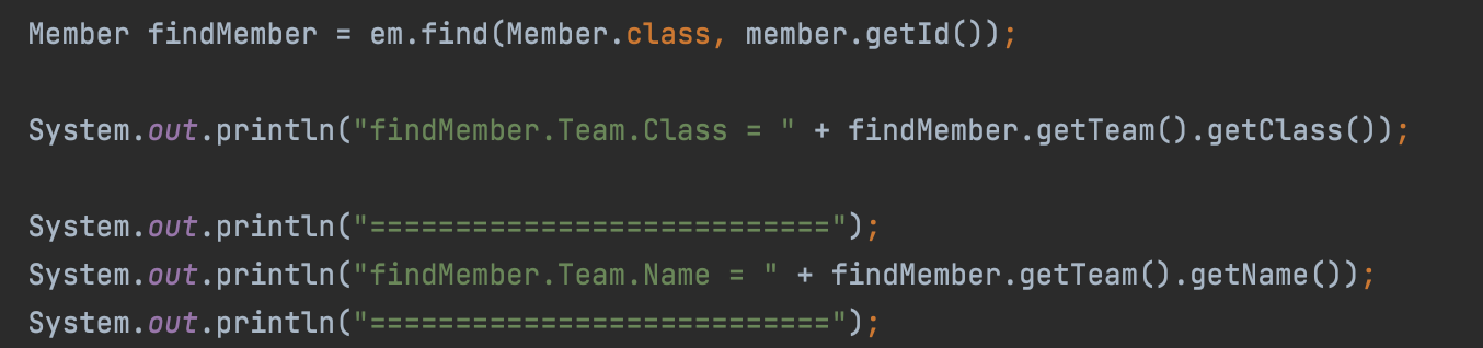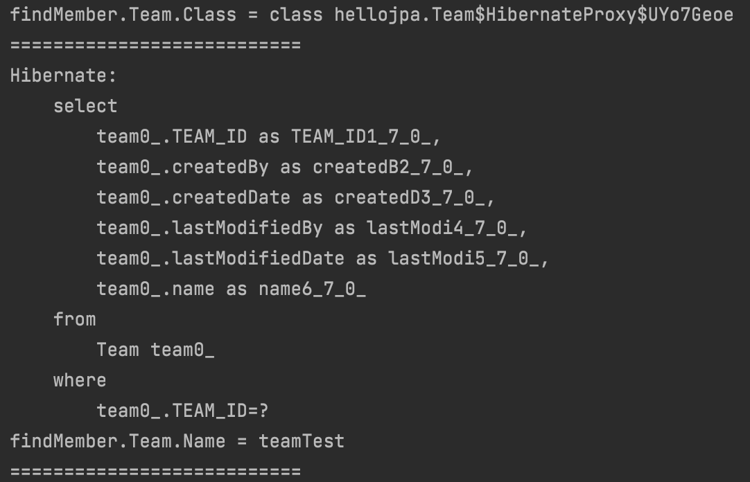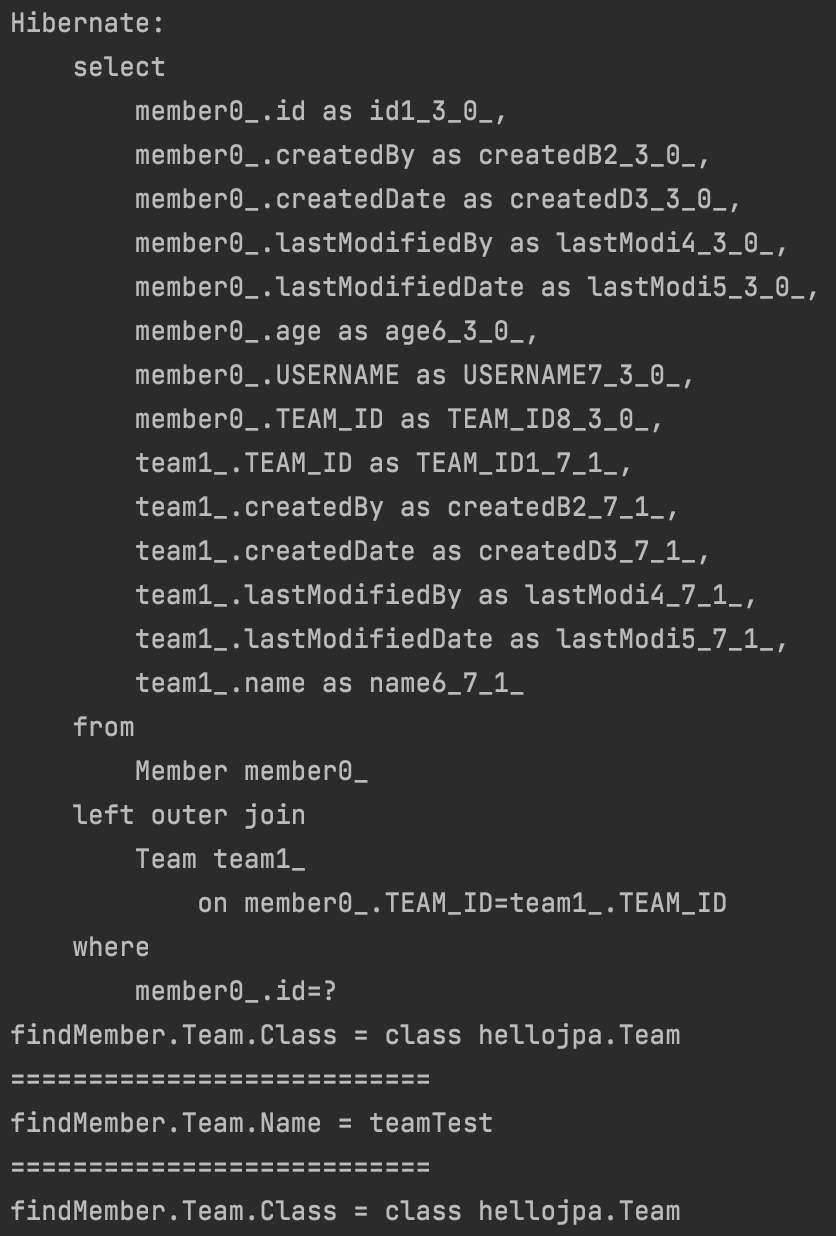 LAZY 테스트 할 때와 같은 코드로 EAGER일 때 실행해 보았습니다. 출력된 쿼리문으로 Member와 Team 객체를 한 번의 쿼리로 조회하는 것을 볼 수 있습니다. LAZY는 Member->Team의 플로우에서 두번 쿼리문을 날리는 것에 비해 효율적으로 보입니다. 가져온 Team의 객체는 프록시 객체가 아닌 진짜 객체를 가져온 것을 볼 수 있습니다.