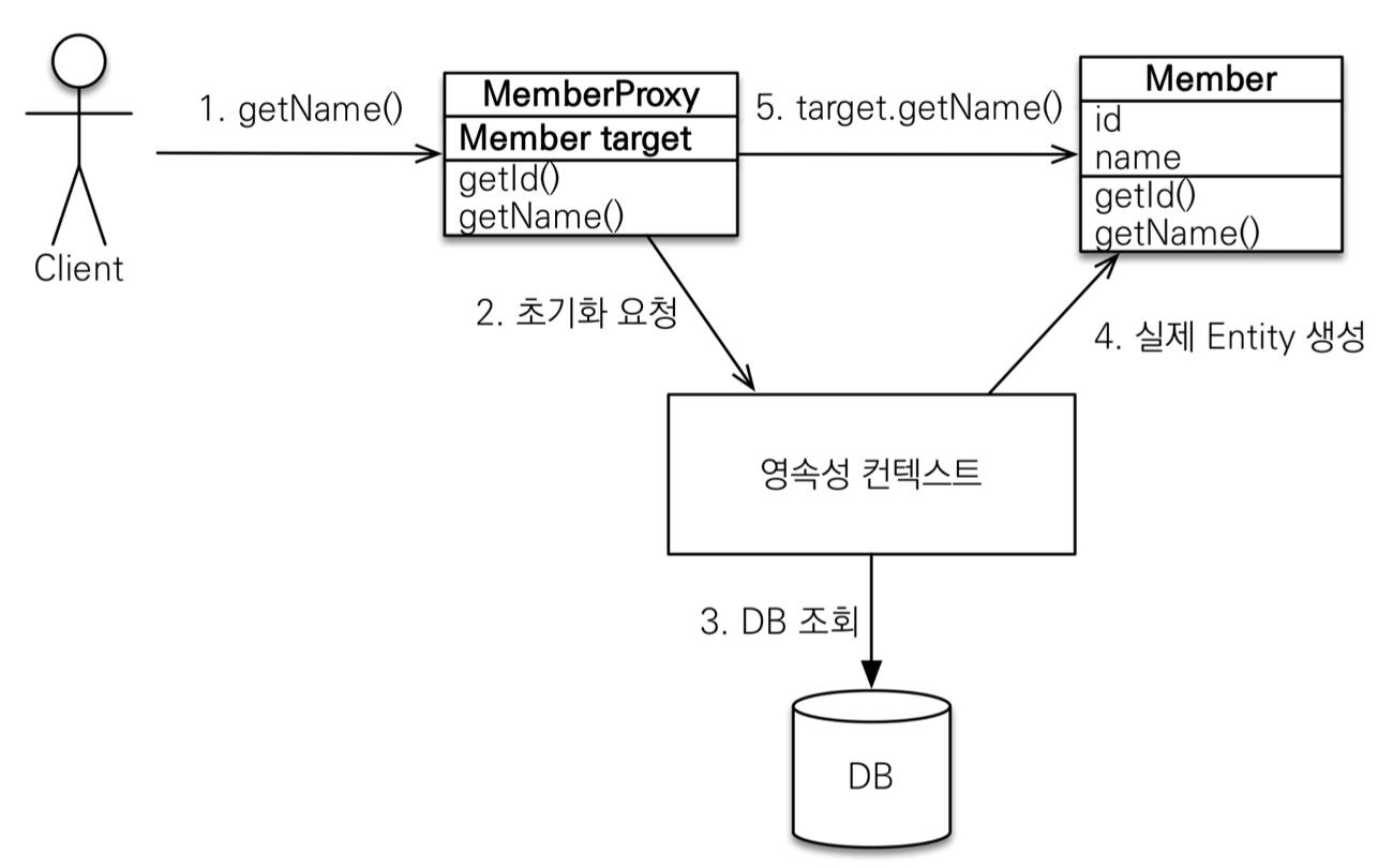 - 프록시 객체를 호출하면 프록시 객체는 실제 객체의 메소드 호출 (여기서 DB에 쿼리가 나감)