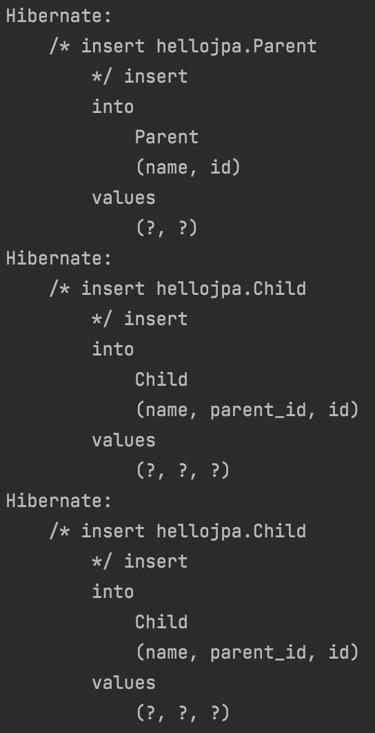 하지만 cascade를 all로 설정하면 연관관계의 주인을 저장할 때에는 연관관계의 주인 뿐만이 아닌 하위 객체들 모두 DB에 insert 쿼리문이 나가며 저장된다. 아래는 위의 코드로 실행했을 때의 출력되는 쿼리문.