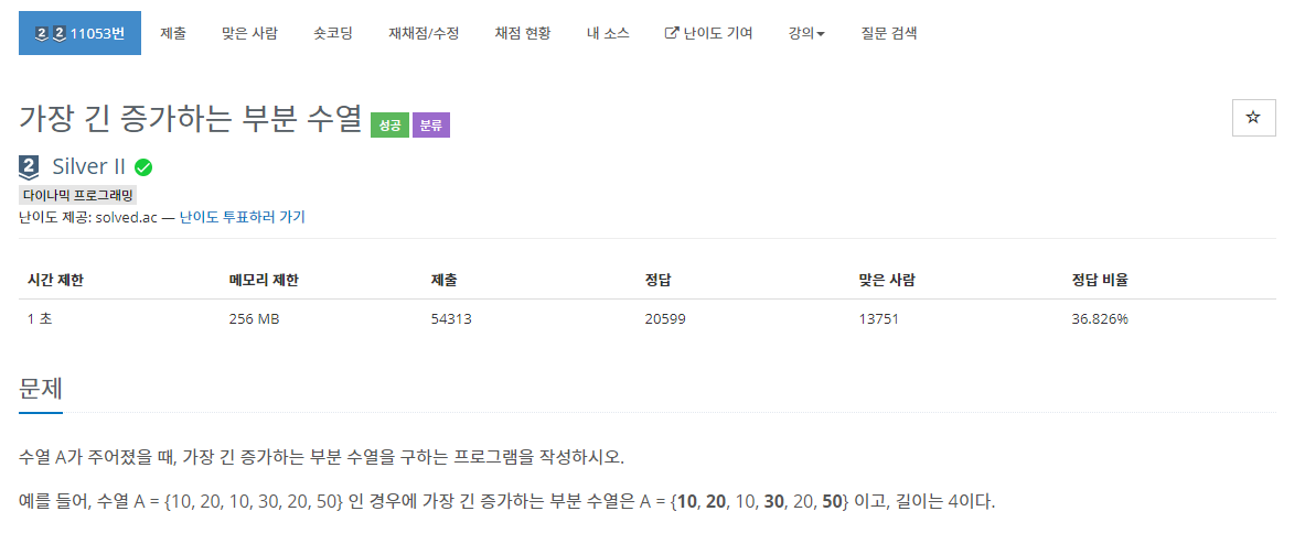 성공 코드 : 점화식을 통해 문제를 풀었다. 점화식은 현재 위치에 있는 값보다 작은 위치에 있는 값의 dp index 값보다 +1한 값을 가져온다. 없다면 그대로 1의 값을 갖는다.