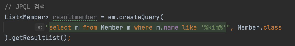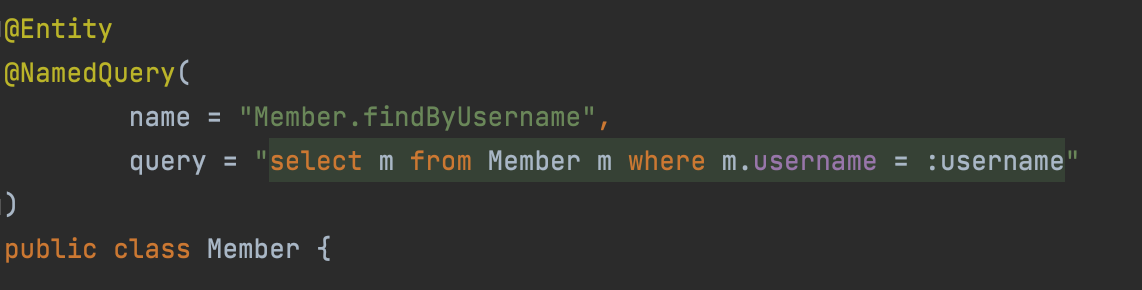 - 엔티티 이름 사용, 테이블 이름이 아님(Member)