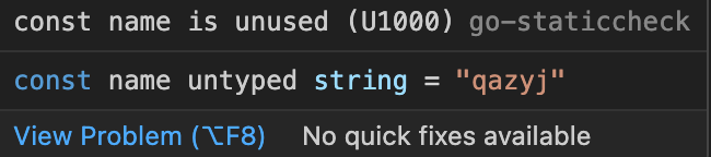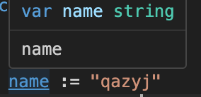 이게 뭐지 싶겠지만 name에 마우스 커서를 위치시켜 보면 아래와 같은 문구를 볼 수 있다. var와 type을 생략할 수 있도록 도와준다. :=를 사용하면 Go에서 자동으로 적절한 type을 설정해준다. 이를 부르는 용어는 Go의 짧은 변수 선언이라고 한다.