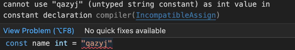 타입은 위와같이 작성해주면 된다. 당연하게도 string 대신 bool, int와 같은 타입은 작성해준다면 아래와 같은 에러를 발생해주며 코드 작성을 도와준다.