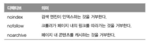 content 속성에는 다양한 디렉티브를 기술할 수 있다. 구글 봇이 해석하는 디렉티브에 관한 자세한 내용은 구글 사이트(https://developers.google.com/search/docs/crawling-indexing/robots-meta-tag)에 기재되어 있다. 대표적으로는 아래와 같다.