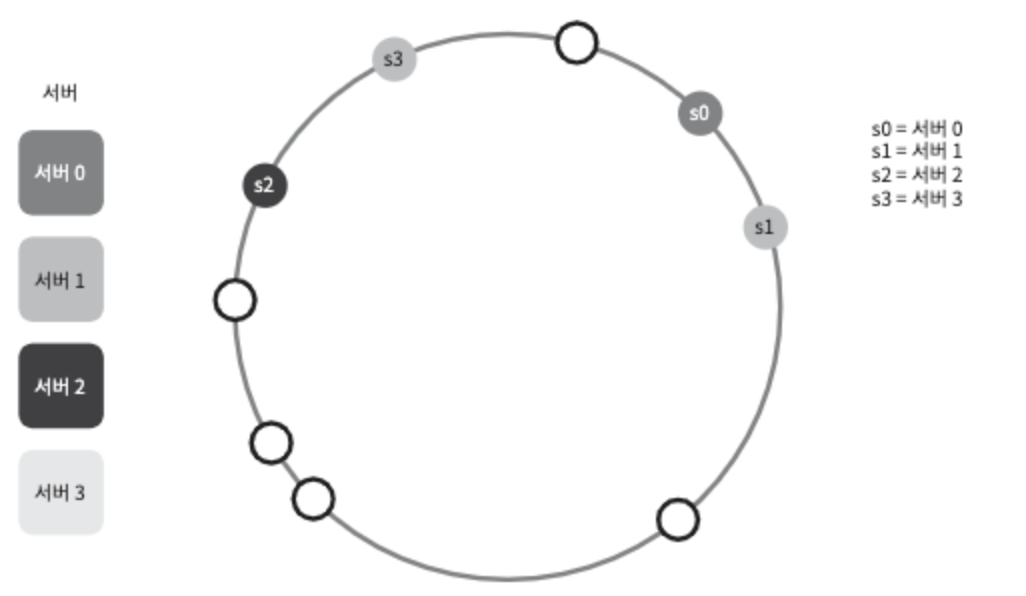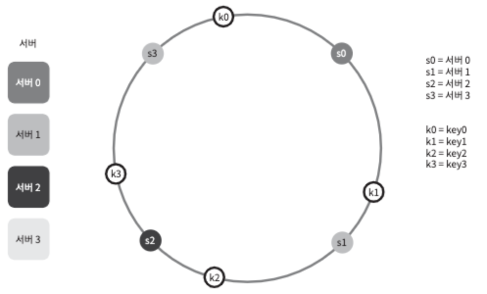 어떤 키가 저장되는 서버는, 해당 키의 위치로부터 시계 방향으로 링을 탐색해 나가면서 만나는 첫 번째 서버다.