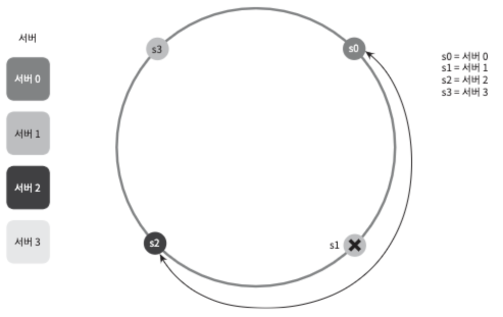 그림 5-1은 표의 key가 어떻게 분산되는지 보여준다. 해당 방법은 Server pool의 크기가 고정되어 있을 때, 그리고 데이터 분포가 균등할 때는 잘 동작한다. 하지만 서버가 추가되거나 기존 서버가 삭제되면 문제가 생긴다. 예를들어, server1이 장애가 발생하여 동작할 수 없을 때, server pool의 크기는 3으로 변한다. 키에 대한 해시 값은 변하지 않지만 나머지 연산을 적용하여 계산한 서버 인덱스 값은 달라질 것이다. 따라서 그림 5-2와 같은 결과를 얻는다.