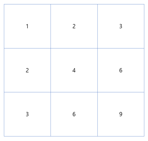 만약, N이 3이라 할때 A배열이다. B 배열은 (1,2,2,3,3,4,6,6,9)순서가 될 것이다.