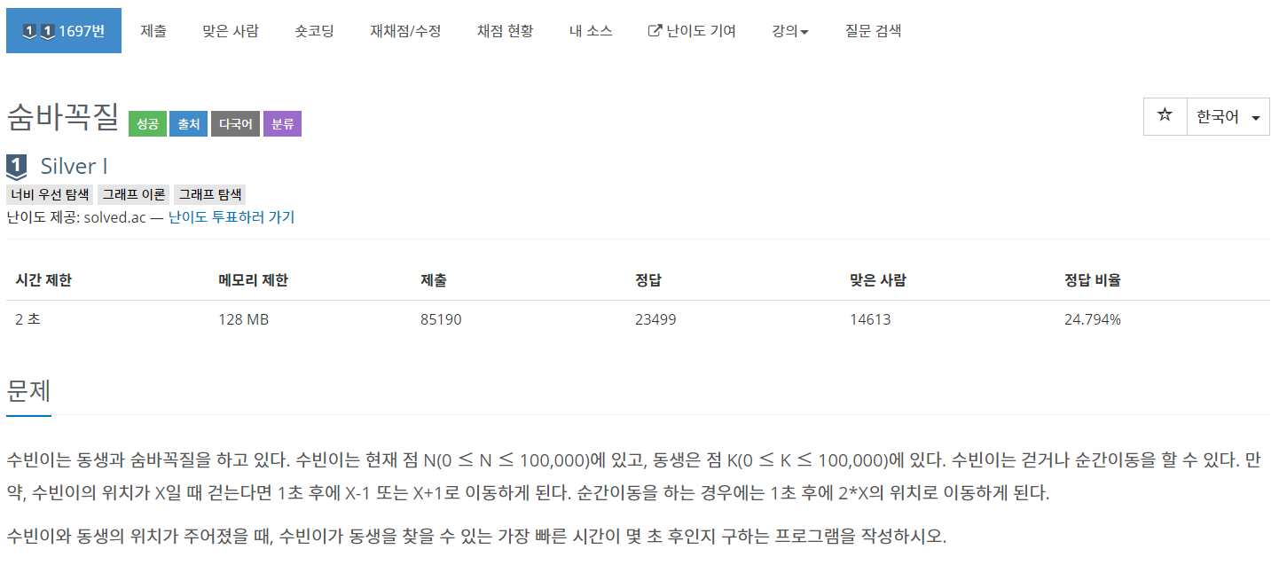 정답 코드 : 100,000개의 배열을 만들어 n+1, n-1, n*2 번째 체크, 체크하다가 N과 K가 같아지면 출력
