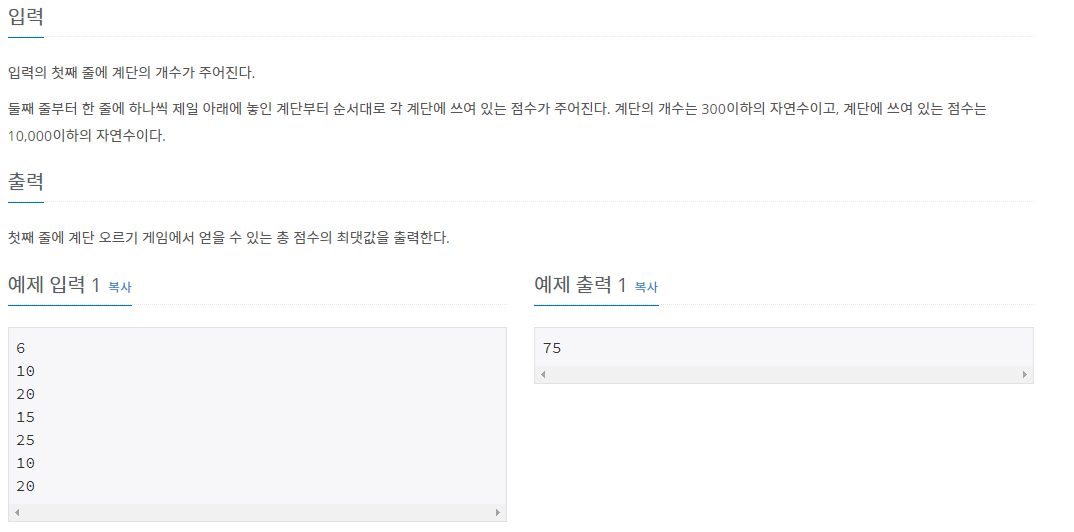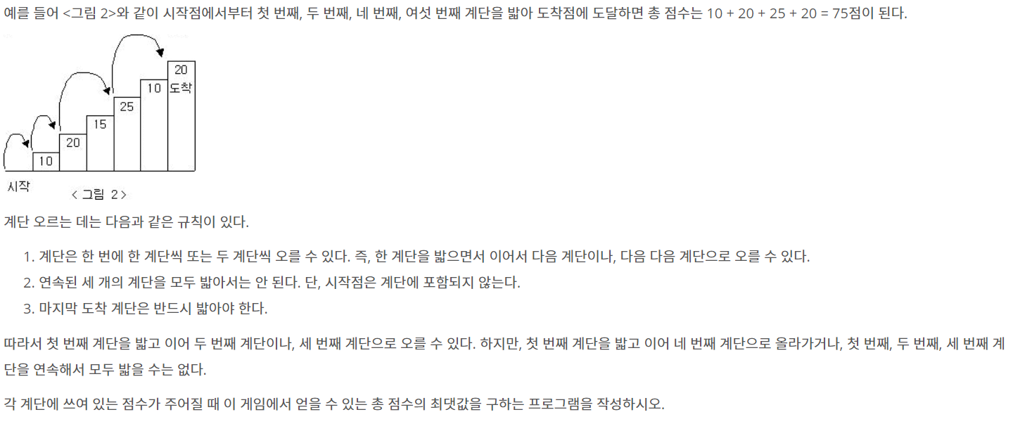 계단 오르기 게임은 계단 아래 시작점부터 계단 꼭대기에 위치한 도착점까지 가는 게임이다. <그림 1>과 같이 각각의 계단에는 일정한 점수가 쓰여 있는데 계단을 밟으면 그 계단에 쓰여 있는 점