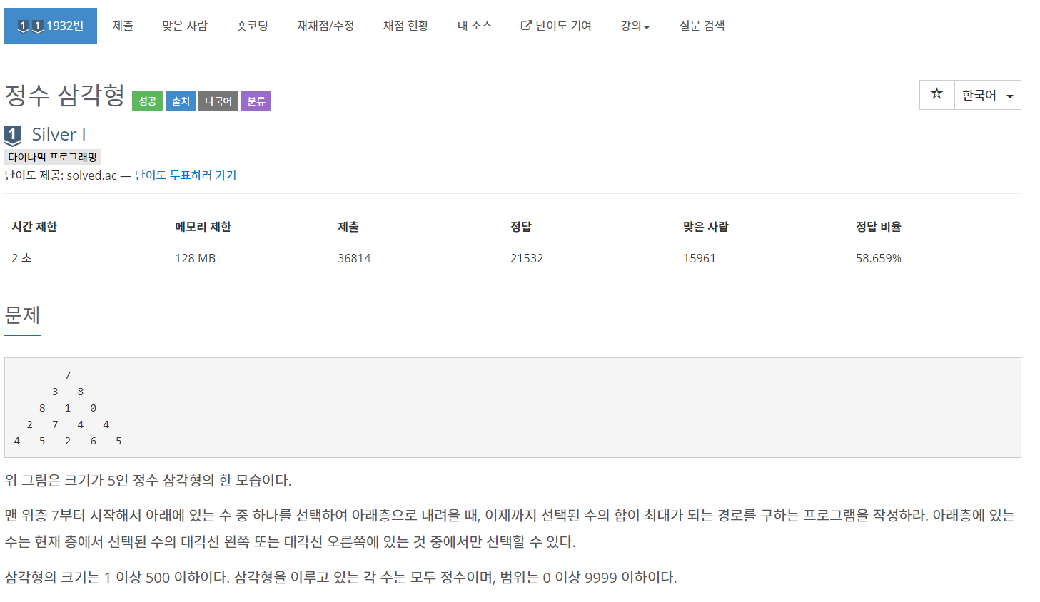정답 코드 : 한 노드를 기준으로 그 전의 행의 대각선(왼쪽, 오른쪽) 값을 더해서 최대가 되는 값을 현재 노드에 넣어주고 최대가 되는 노드의 값을 출력