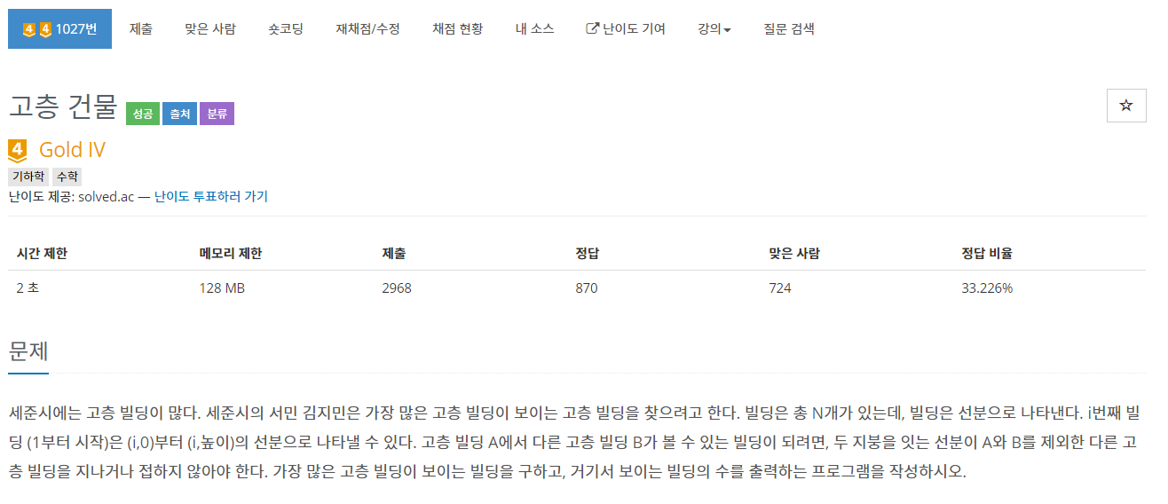 세준시에는 고층 빌딩이 많다. 세준시의 서민 김지민은 가장 많은 고층 빌딩이 보이는 고층 빌딩을 찾으려고 한다. 빌딩은 총 N개가 있는데, 빌딩은 선분으로 나타낸다. i번째 빌딩 (1부터 시작)