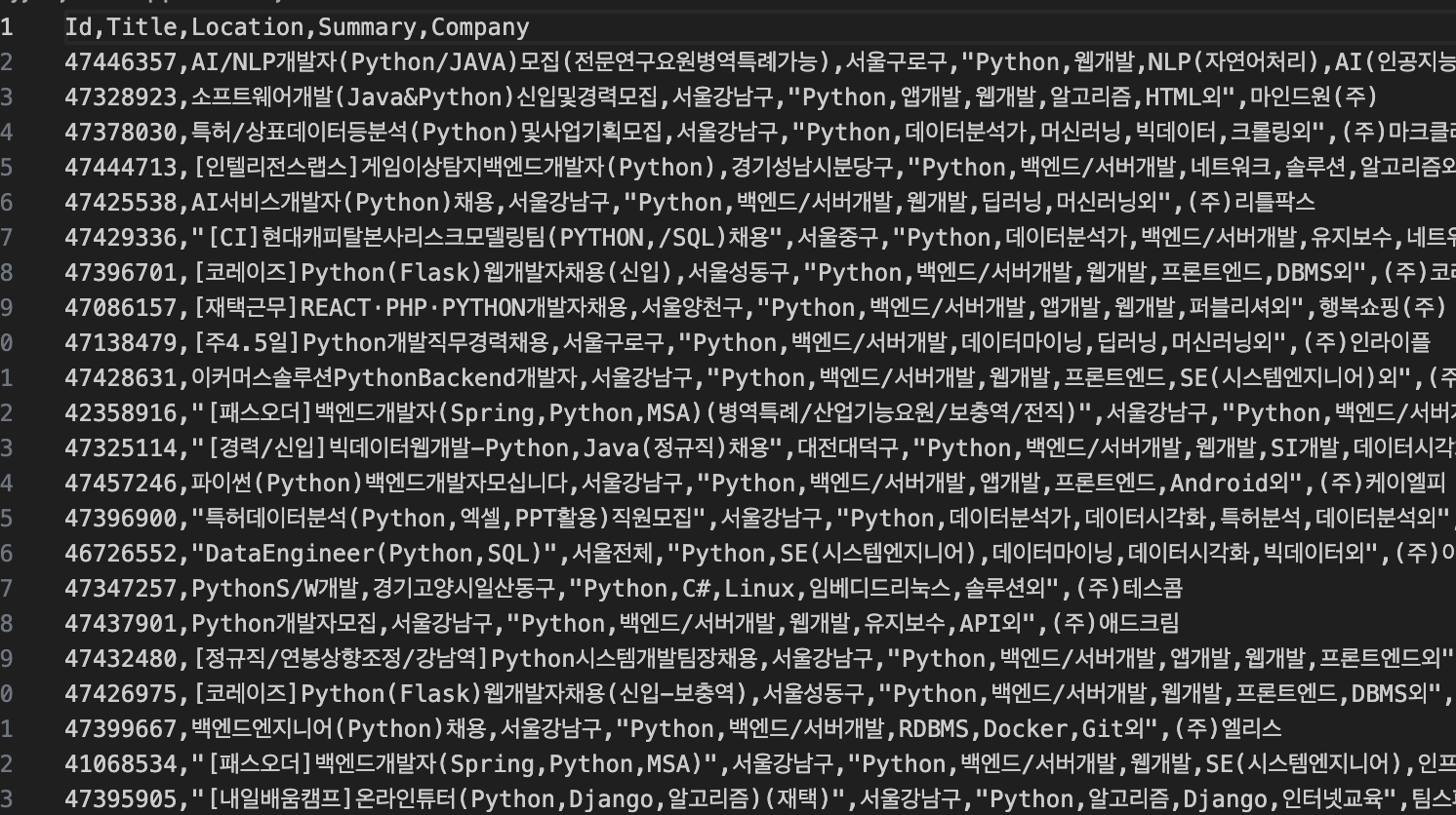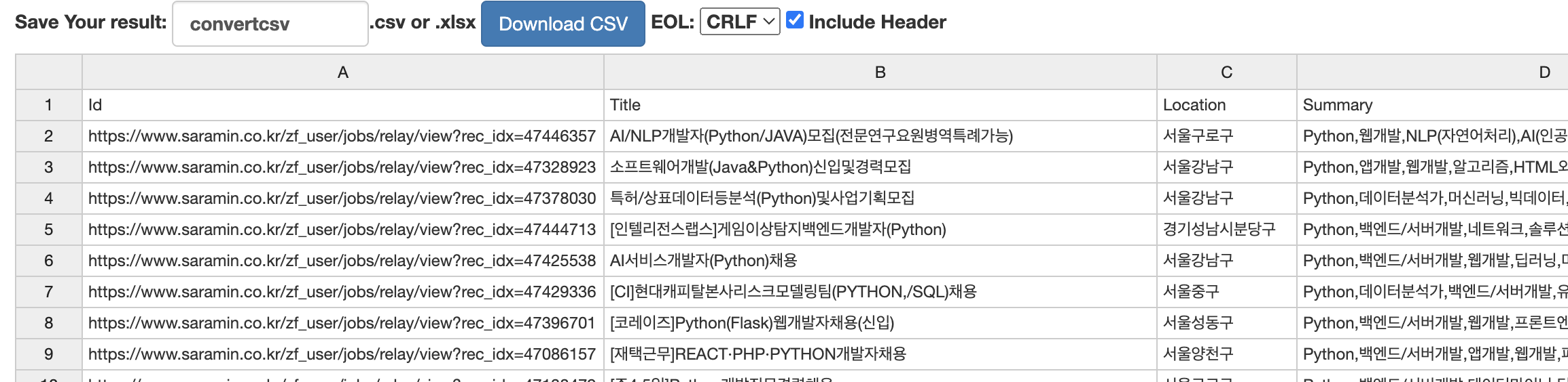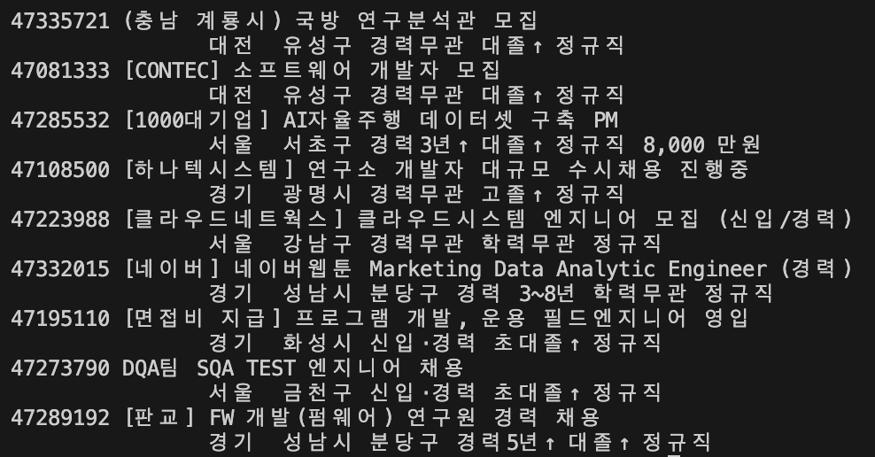 페이지를 넘기는 방법은 위처럼 recruitPage를 사용하여 페이지 번호를 넘길 수 있다. 기본 URL에 recruitPage 번호를 통해 각각의 모든 공고들을 페이지 번호를 넘겨가며 크롤링할 수 있다.