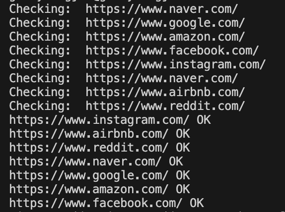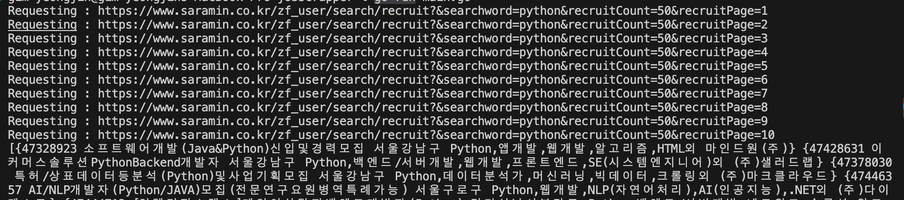 goroutine 사용 전 후를 비교해보면 recruitPage의 순서가 다르다는 것을 볼 수 있다. goroutine을 사용하여 병렬적으로 수행했기 때문이다. 프로그램을 돌려보면 이전보다 확실히 빠르다는 것을 느낄 수 있다. 체감상 2~3배 정도 빨라진 것 같다.