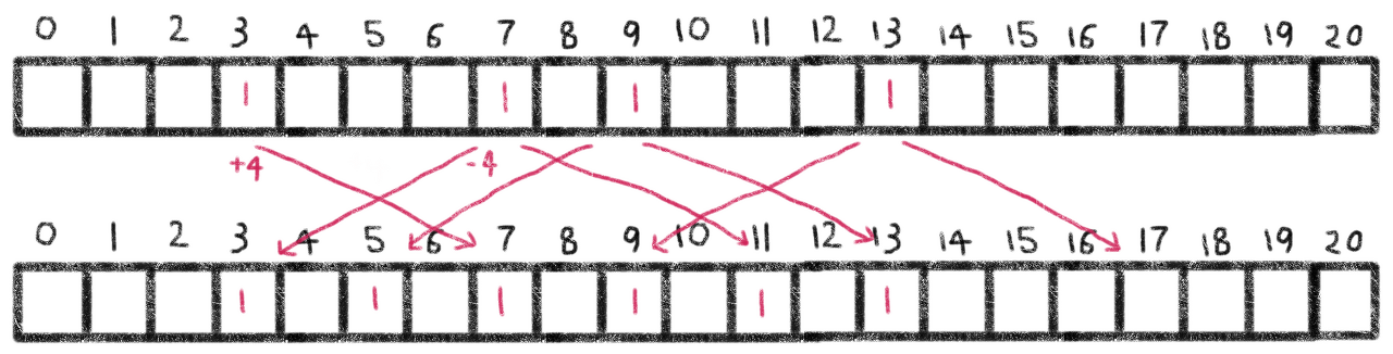 4가 올 때 할 수 있는 연산은 +4, -4 로 범위를 넘어가면 빼주면 된다.