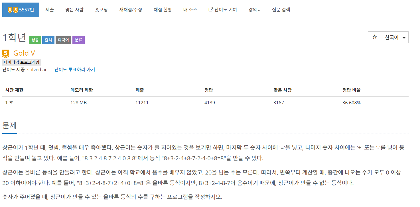 백준 5557 - 1학년 상근이는 덧셈, 뺄셈을 통해 줄 지어진 숫자를 연산하여 가장 마지막 숫자가 나오도록 하고자 한다. 그러나, 연산 도중에 나올 수 있는 숫자는 0이상 20이하라고 한다. 여기서