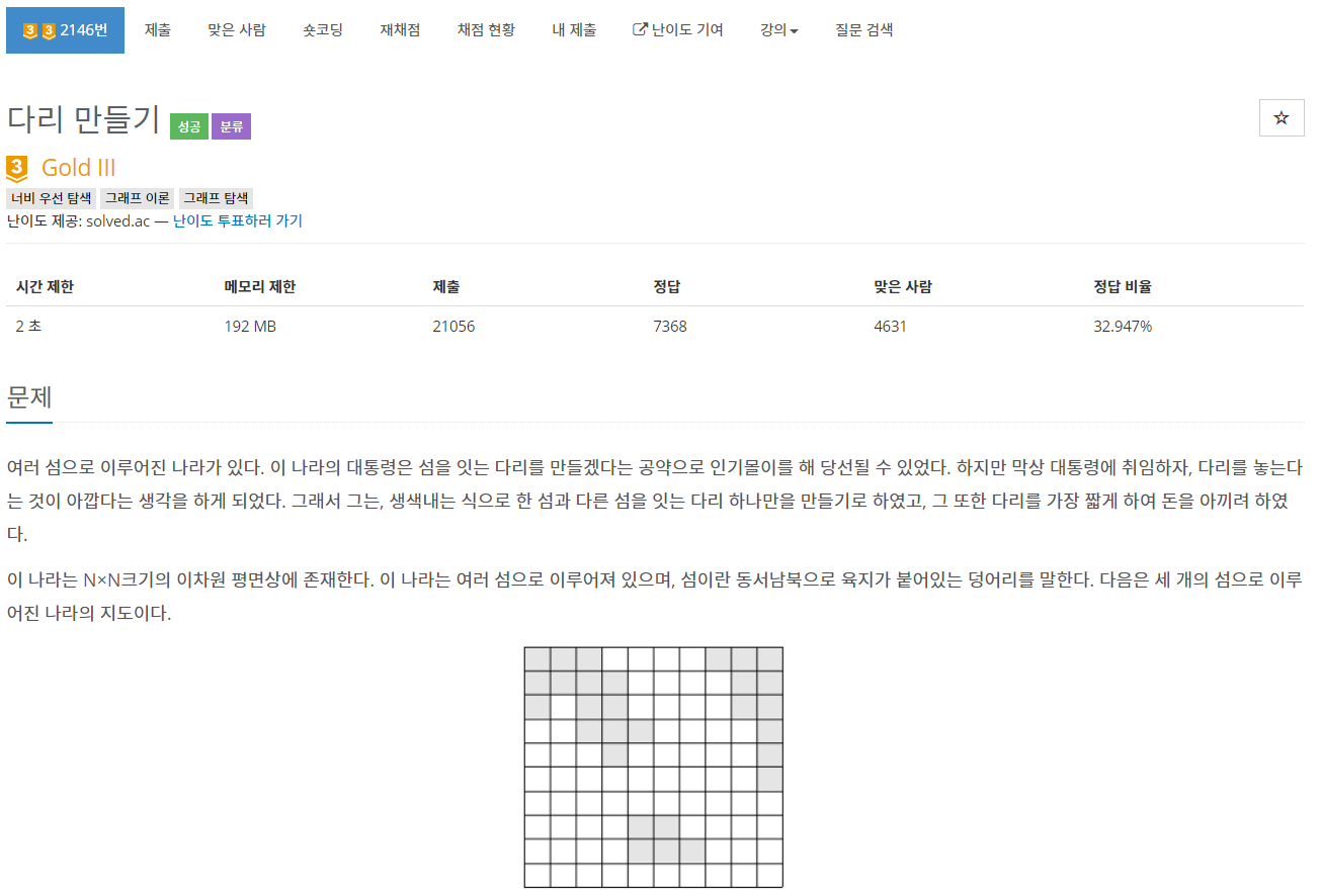 오늘은 오랜만에 BFS 문제를 풀어보려 한다. 백준 2146번 다리 만들기 문제이다. https://www.acmicpc.net/problem/2146 2146번: 다리 만들기 여러 섬으로 이루어진 나라가 있다. 이 나라의 대통령은 섬을 잇는