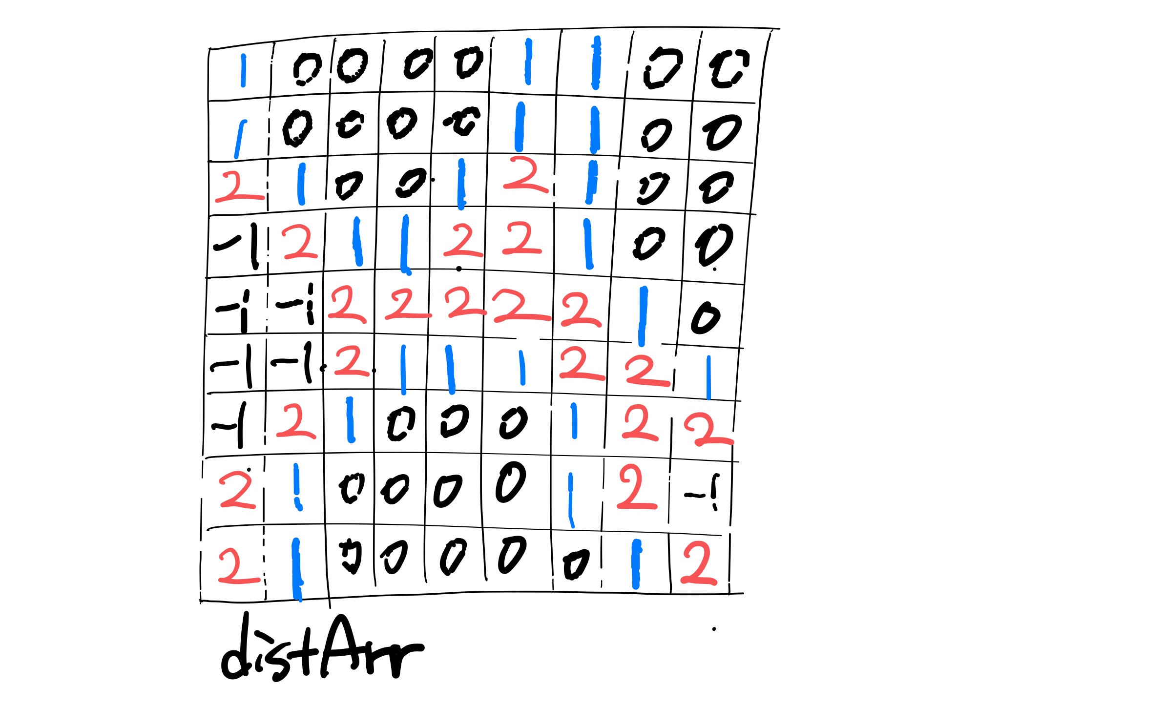 이렇게 만들고 나서 distArr에서 BFS를 통해 모든 점에 대해 섬에서부터 거리가 얼마나 되는지를 계산한다. 섬 위에 있다면 당연히 그 값은 0이다. 그리고 그 섬에서 인접한 값들은 1이고 그 값에서 인접한 값은 2일 것이다. 그런식으로 -1로 초기에 설정된 점들은 섬들로부터 최단거리를 계산해서 그 값을 넣어 준다.