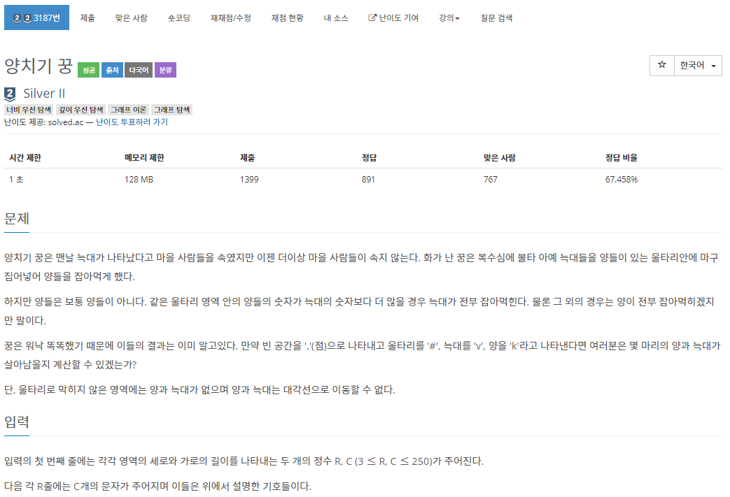 bfs 문제이다. 이차원 배열을 한 영역에서 양과 늑대의 수를 비교해주면서 돌면된다.