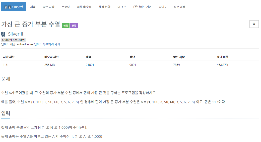 | [JAVA] 백준 11055번 : 가장 큰 증가하는 부분 수열 (0) | 2020.12.10 |