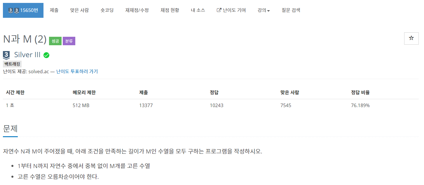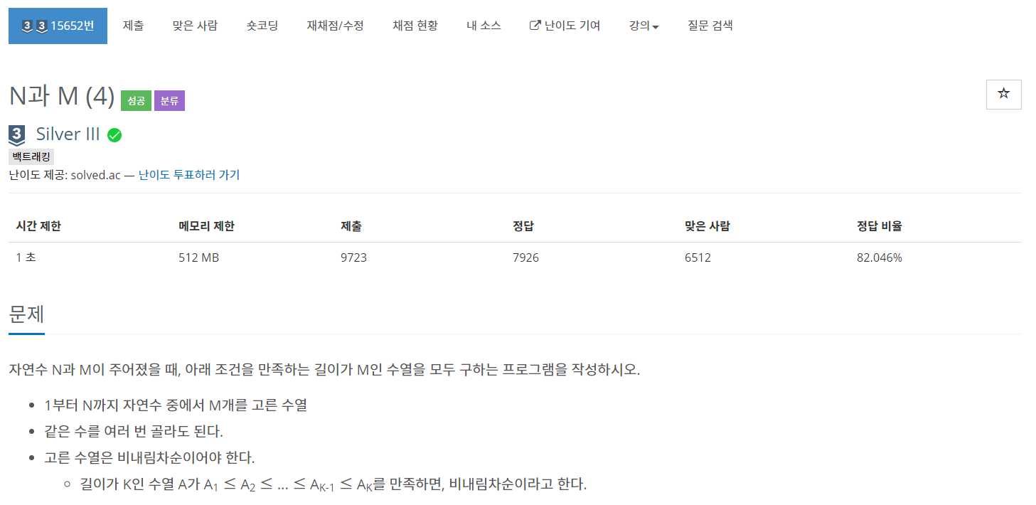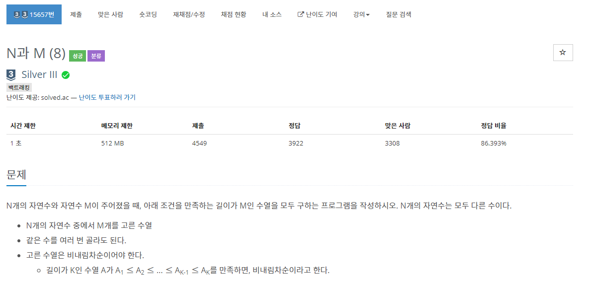 정답 코드 : 기존 N과 M(7)코드에서 오름차순만 출력할 수 있는 코드를 추가하였다.