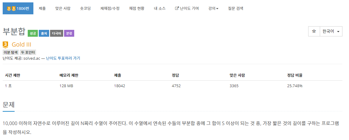 정답 코드 : 입력한 배열 중 연속된 수의 합이 S이상일 때의 최소길이를 찾는 것이었다. 투 포인터를 사용하면 될 것 같아서 투포인터를 활용하여 풀었다.