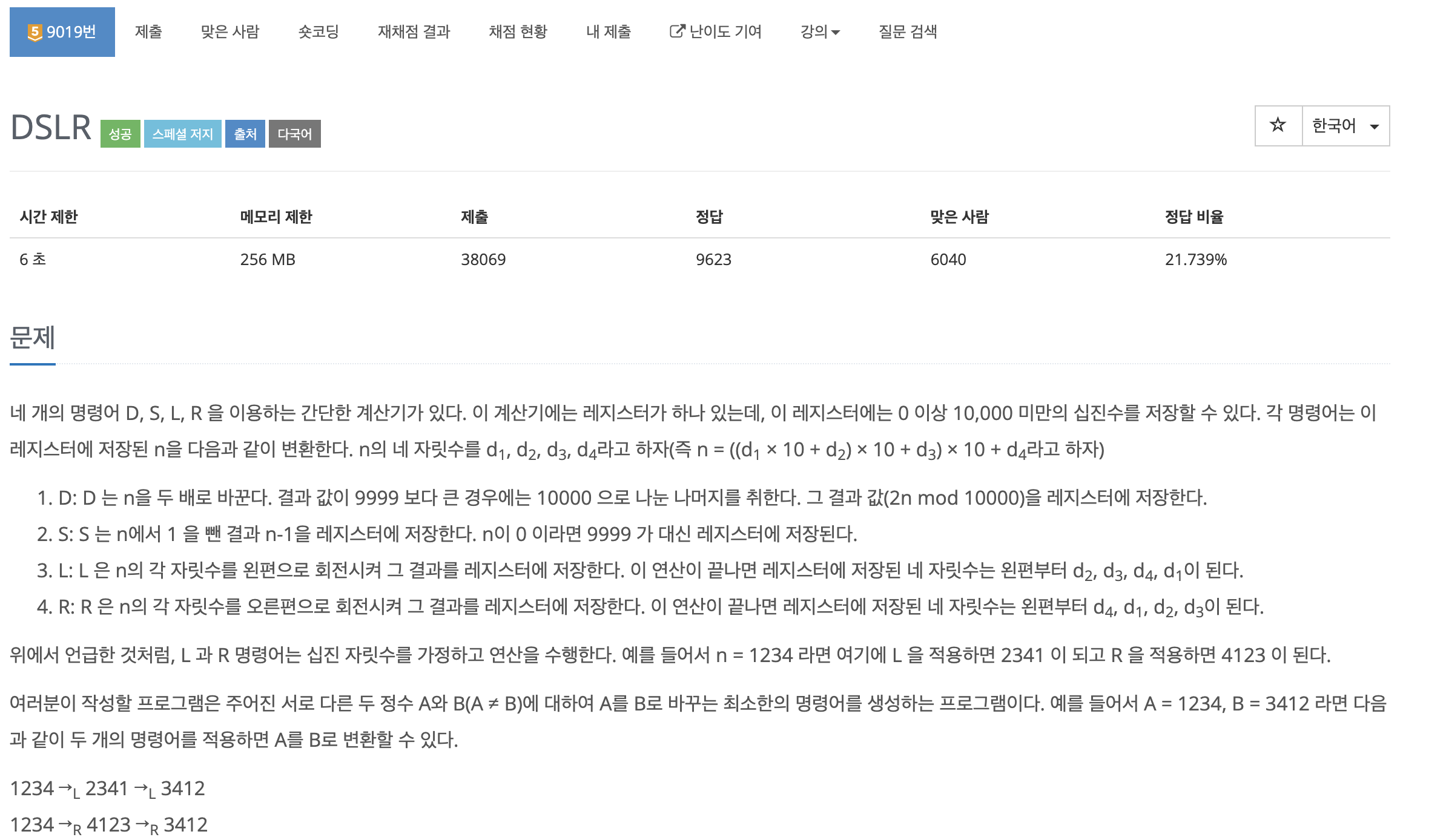 네 개의 명령어 D, S, L, R 을 이용하는 간단한 계산기가 있다. 이 계산기에는 레지스터가 하나 있는데, 이 레지스터에는 0 이상 10,000 미만의 십진수를 저장할 수 있다. 각 명령어는 이 레지스터에