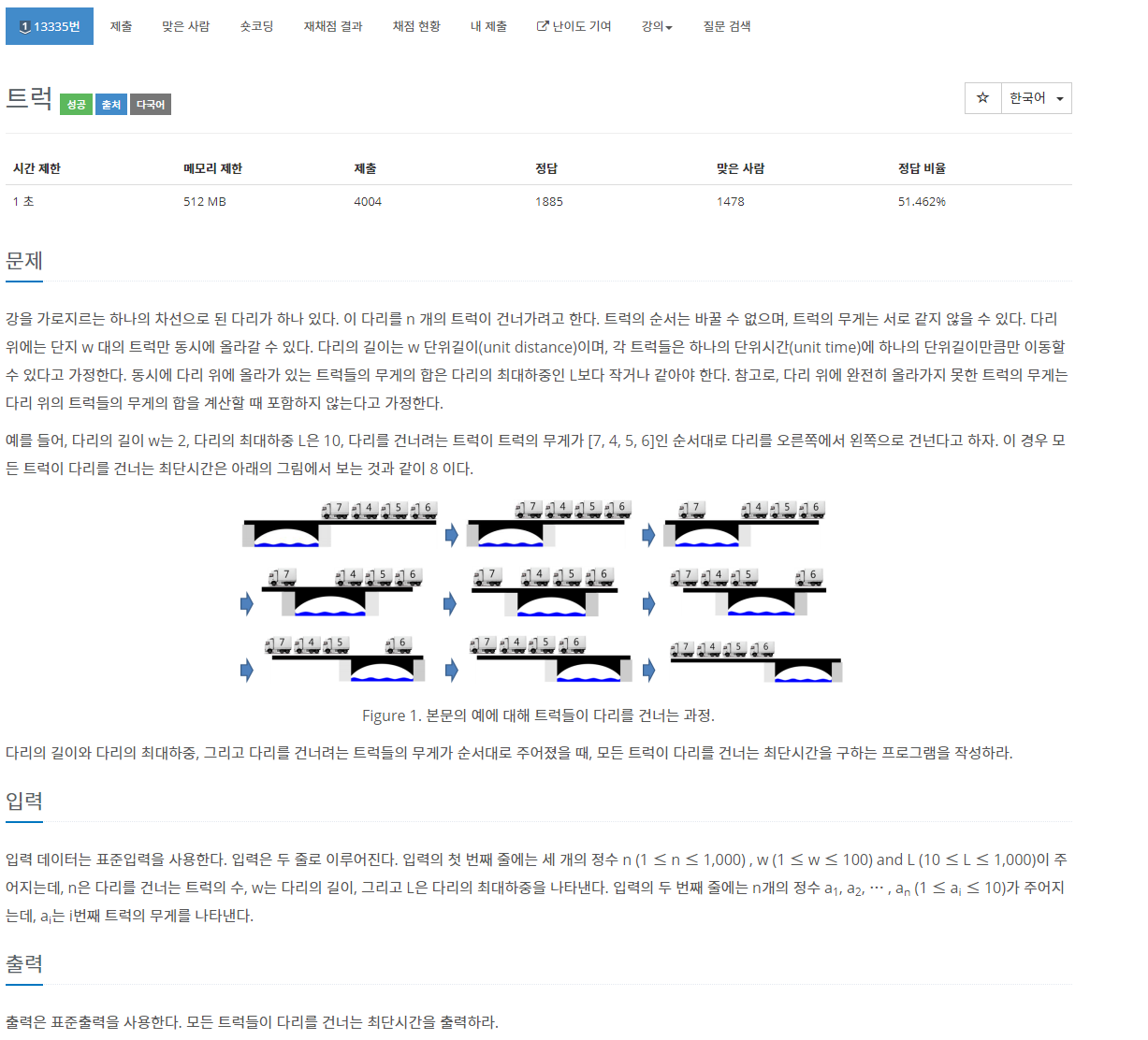 Queue를 이용해서 다리의 무게를 더해가면서 time을 늘려주었다.