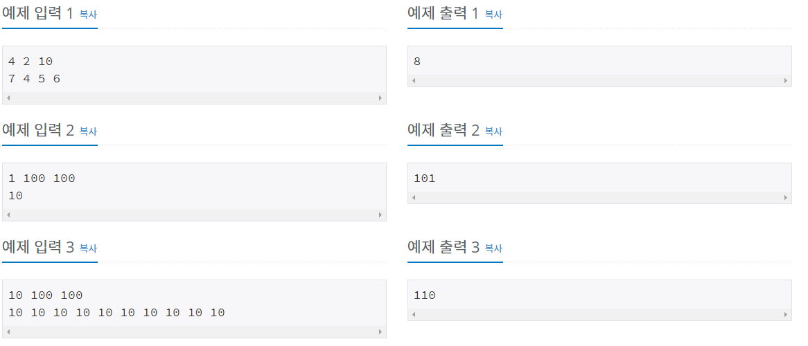 입력 데이터는 표준입력을 사용한다. 입력은 두 줄로 이루어진다. 입력의 첫 번째 줄에는 세 개의 정수 n (1 ≤ n ≤ 1,000) , w (1 ≤ w ≤ 100) and L (10 ≤ L ≤ 1,000)이 주어지는데, n은 다리를 건너는 트